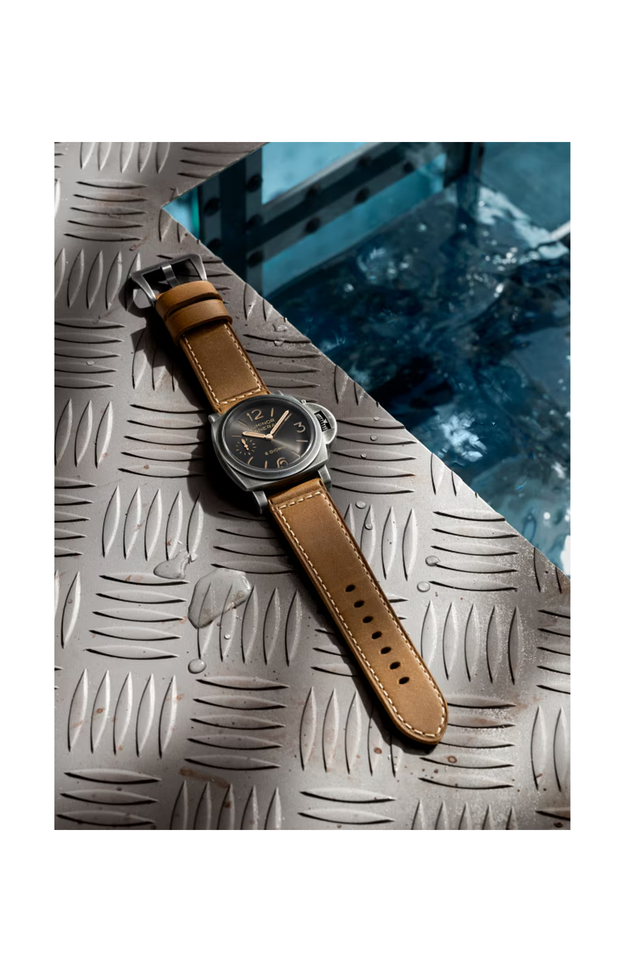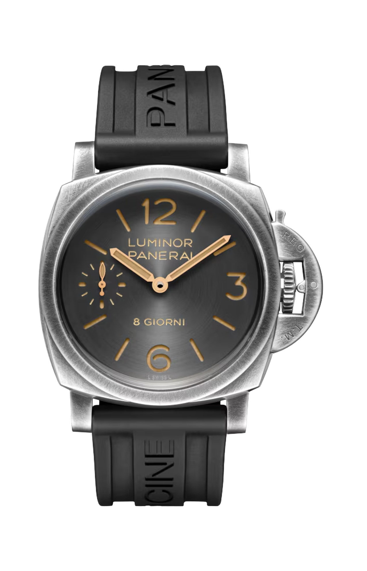 Il quadrante antracite introduce una nuova satinatura circolare, che amplifica i giochi di luce sulla superficie e dona una profondità variabile nel corso della giornata. Numeri arabi, indici e piccoli secondi a ore 9 garantiscono una leggibilità immediata, requisito fondamentale per gli strumenti subacquei originali di Panerai. L’indicazione “8 Giorni” sottolinea la tradizione del brand legata alle lunghe riserve di carica.