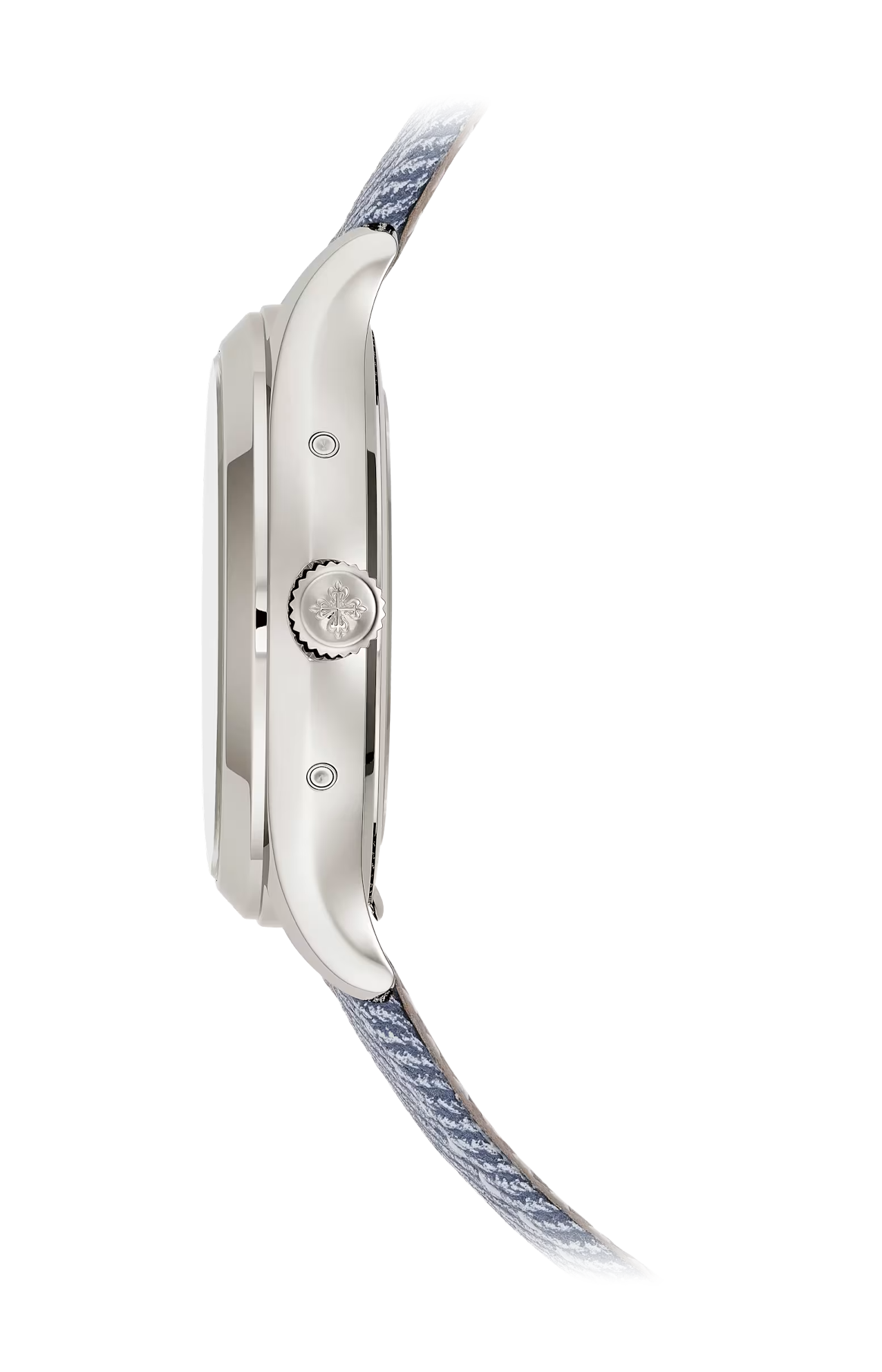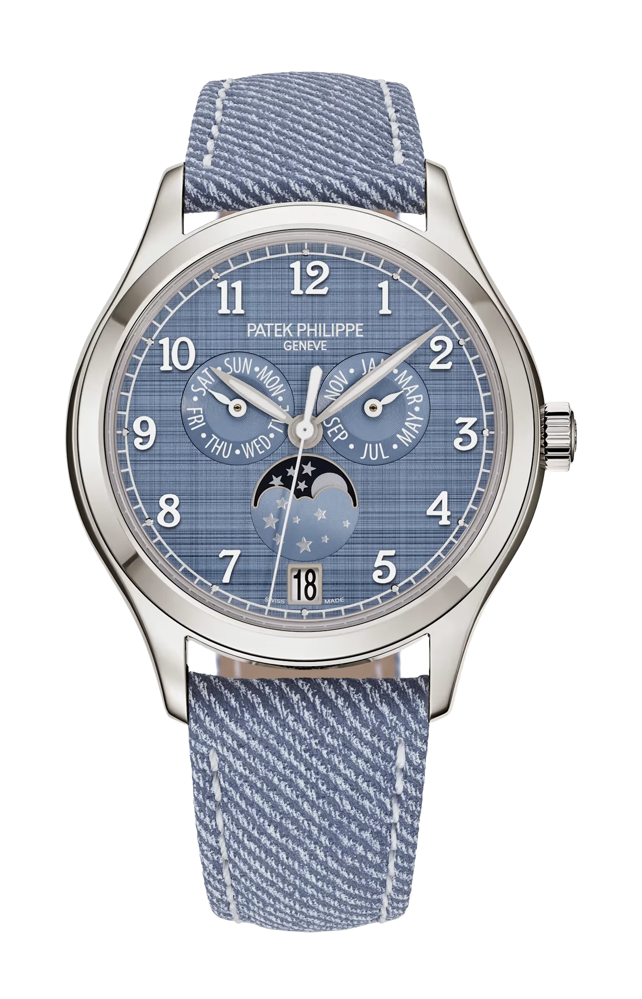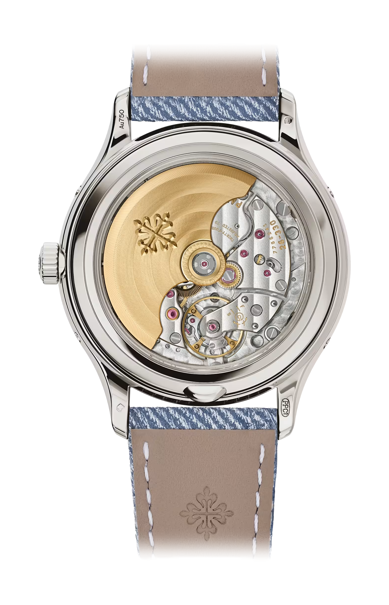 Questa attenzione alla leggibilità e allo stile si riflette anche nei contatori delle fasi lunari, del giorno e del mese con finitura azurée (a cerchi concentrici). Dotato di fibbia ad ardiglione in oro bianco, un cinturino in pelle di vitello blu-grigio con motivo denim e cuciture bianche a contrasto accentua il look decisamente contemporaneo di questo modello.