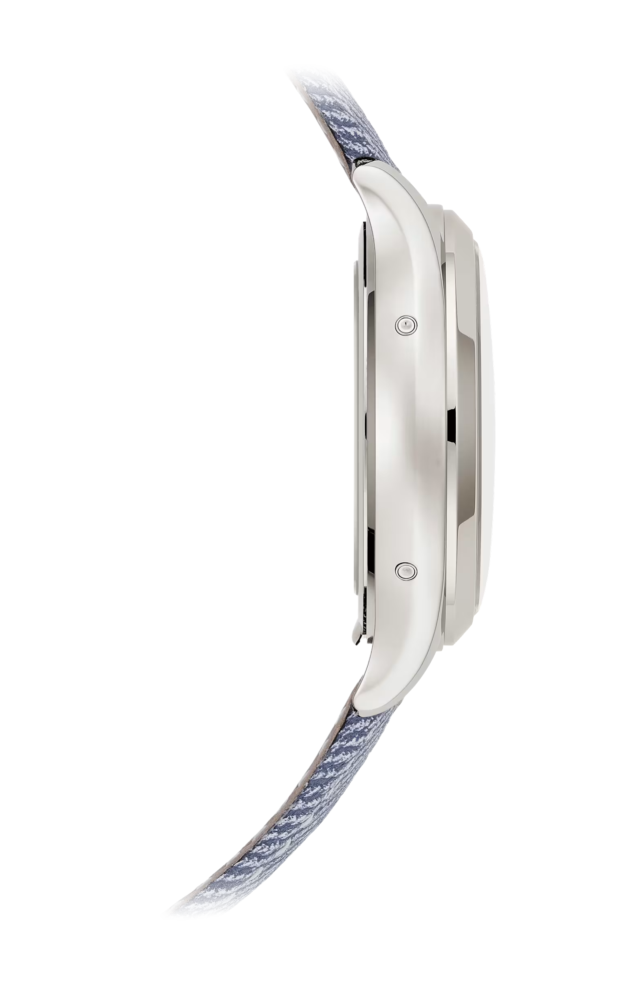 La sofisticata raffinatezza di questo orologio si esprime attraverso la peculiare lucentezza dell’oro bianco con cui è realizzata la sua cassa lucida con diametro di 38 mm, abbinata a un quadrante blu-grigio impreziosito da una doppia finitura satinata verticale e orizzontale che ricorda i tessuti di seta grezza shantung. Il giro delle ore è scandito da lancette a foglia in oro bianco con rivestimento luminescente bianco che scorrono su un elemento speciale di questo nuovo modello: gli indici monoblocco in materiale luminescente bianco, che garantiscono una leggibilità e un contrasto ottimali in ogni condizione di illuminazione.