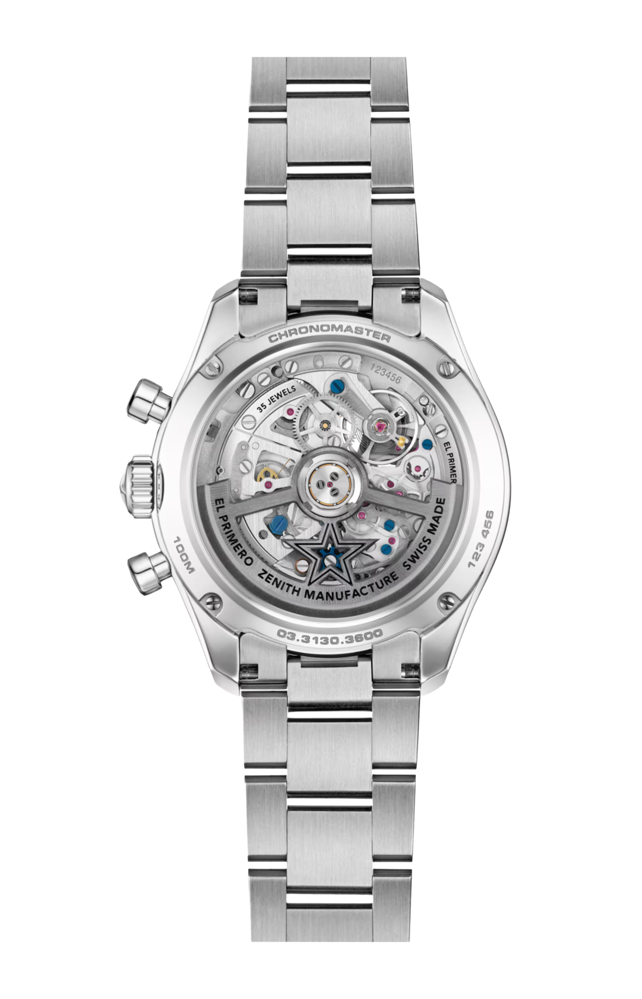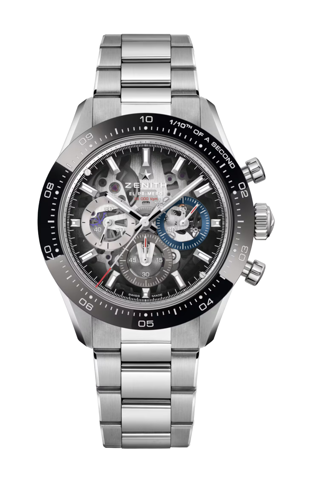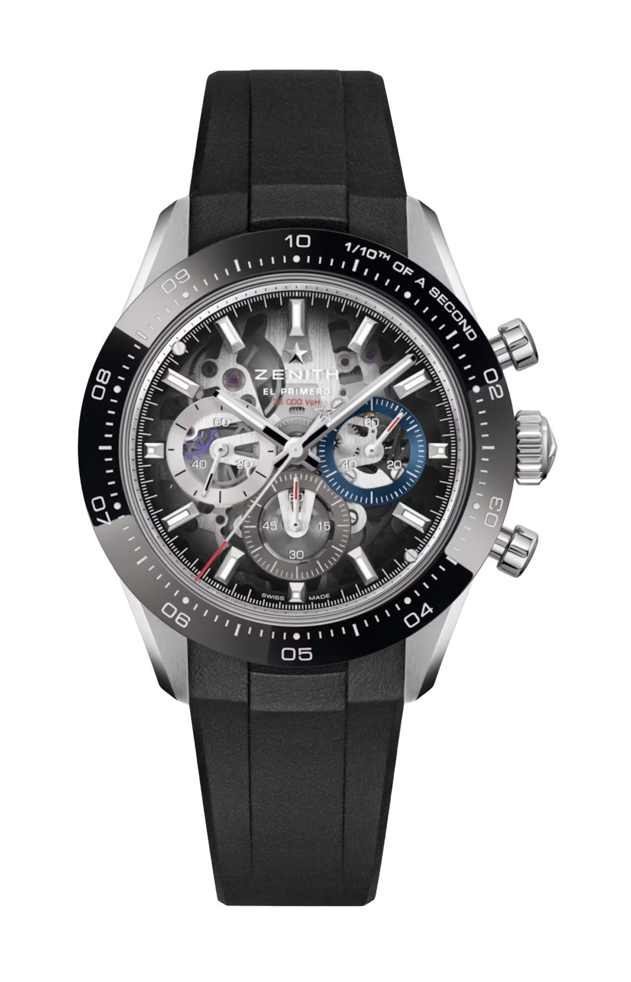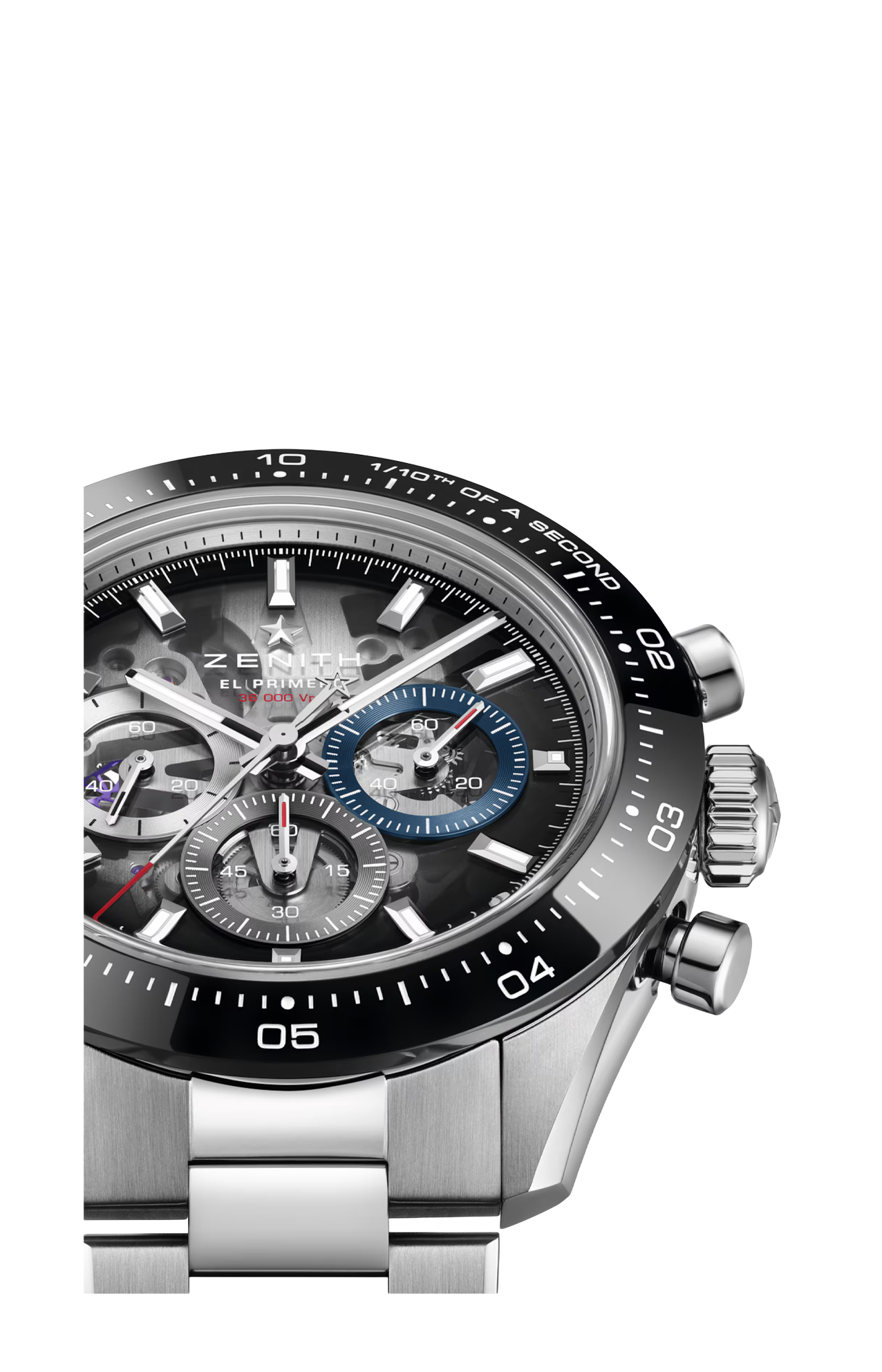 Il movimento cronografico automatico ad alta frequenza El Primero 3600 SK oscilla alla frequenza di 5 Hz (36.000 a/ora) per misurazioni con una precisione al 1/10 di secondo. La struttura scheletrata consente di ammirare i suoi meccanismi complessi, garantendo un’estetica elegante e una riserva di carica di 60 ore.