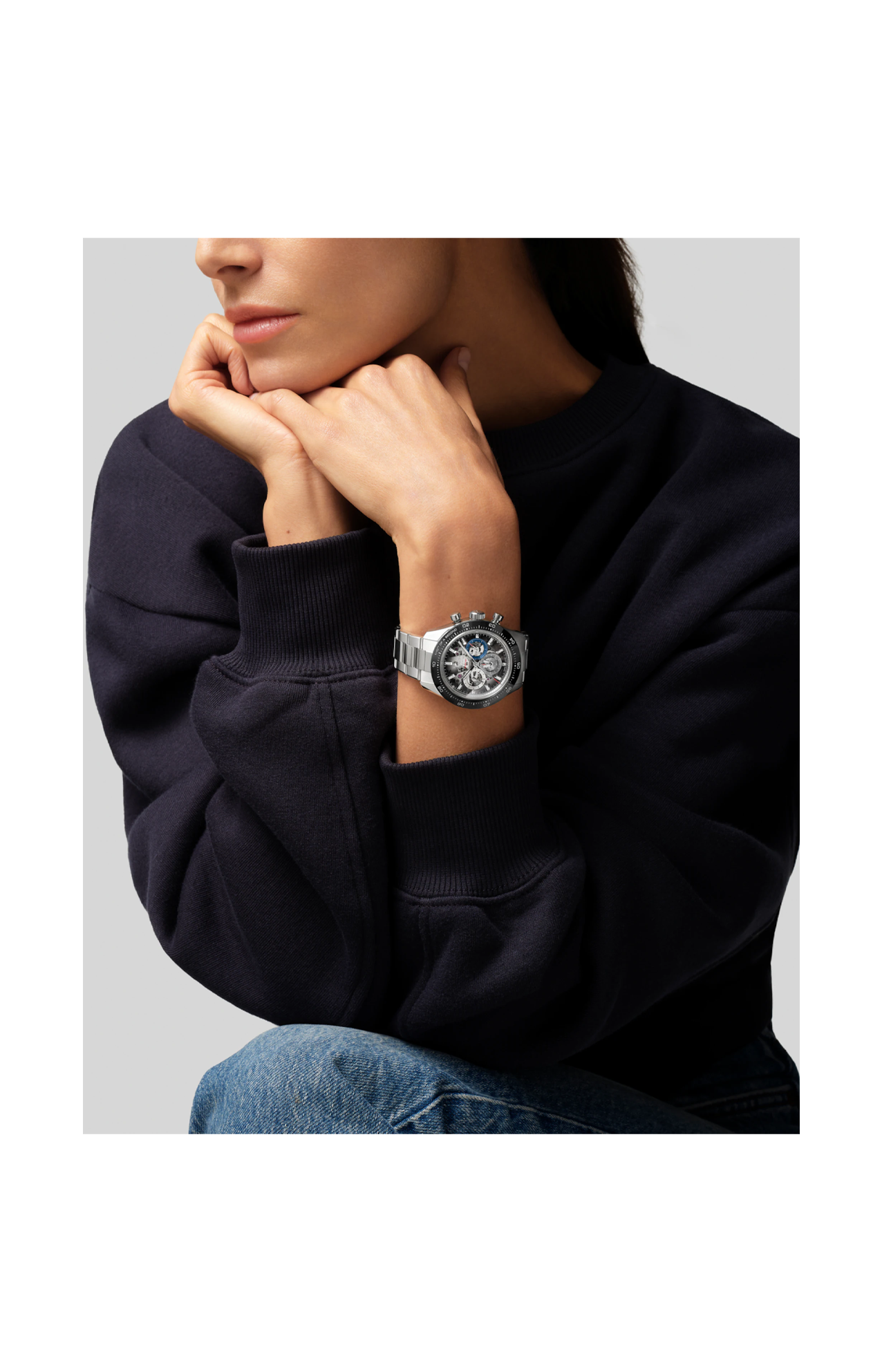 Il CHRONOMASTER Sport Skeleton è realizzato con cassa da 41 mm in acciaio inossidabile con lunetta in ceramica nera resistente ai graffi. Il quadrante in zaffiro sfumato è caratterizzato dai caratteristici contatori tricolori sovrapposti del marchio a ore 3-6-9. Rivela l’architettura scheletrata del movimento El Primero 3600 dotato di cronografo con precisione di lettura al 1/10 di secondo e riserva di carica di 60 ore. Fornito con un bracciale in acciaio con fibbia déployante micro-regolabile e un secondo cinturino in caucciù nero.
