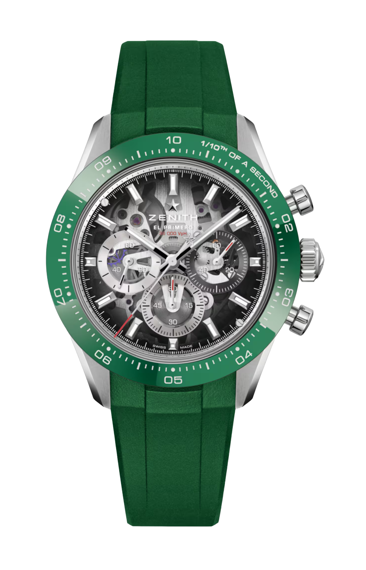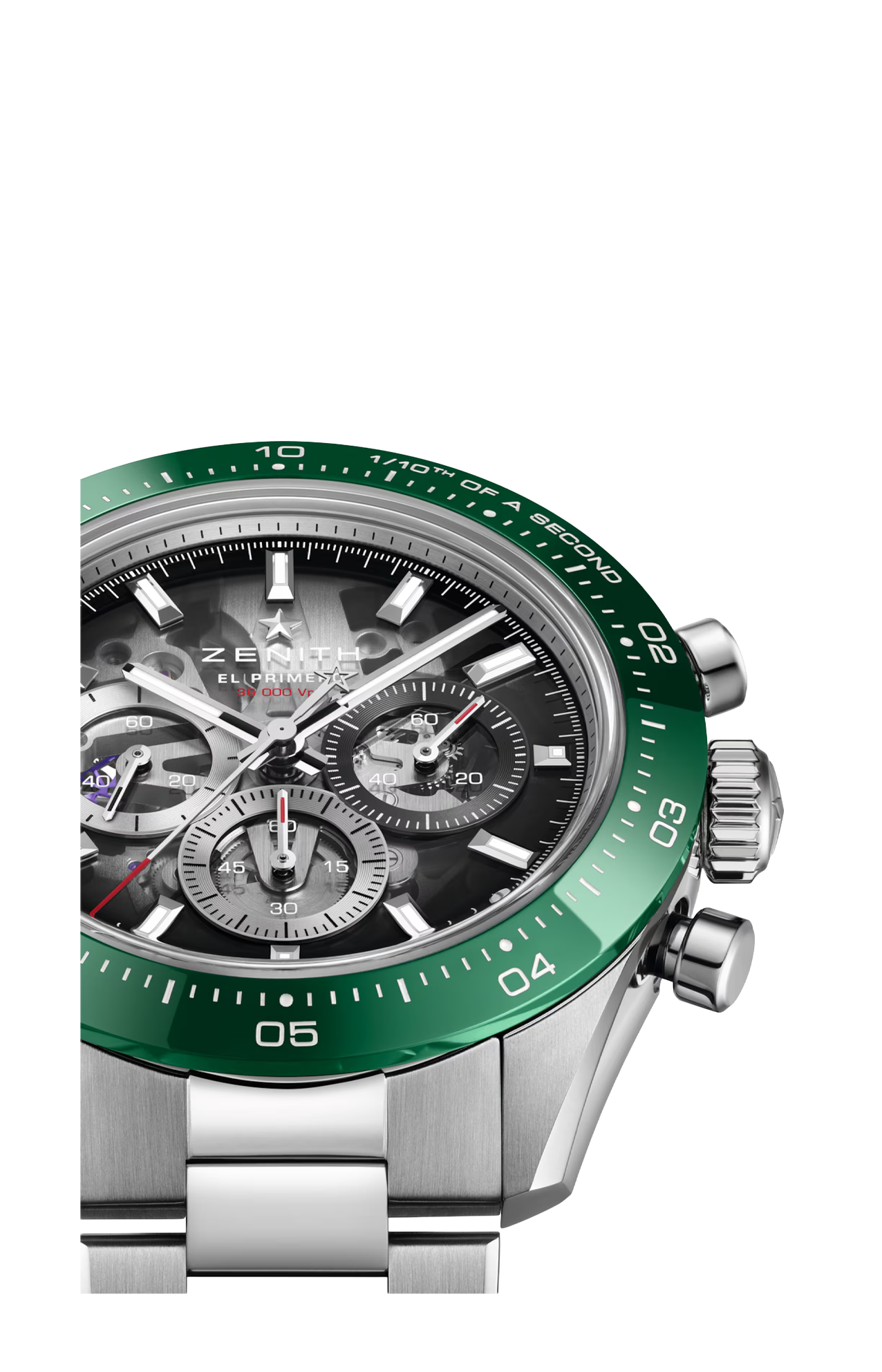 Il Chronomaster Sport Skeleton con la sua straordinaria lunetta in ceramica verde è l’emblema dell’eleganza sportiva. Animato dal movimento ad alta frequenza El Primero 3600 SK, offre una precisione di lettura senza pari al 1/10 di secondo. L’avanzata fibbia déployante micro-regolabile offre un comfort senza pari, un’autentica espressione dello spirito innovativo di ZENITH.