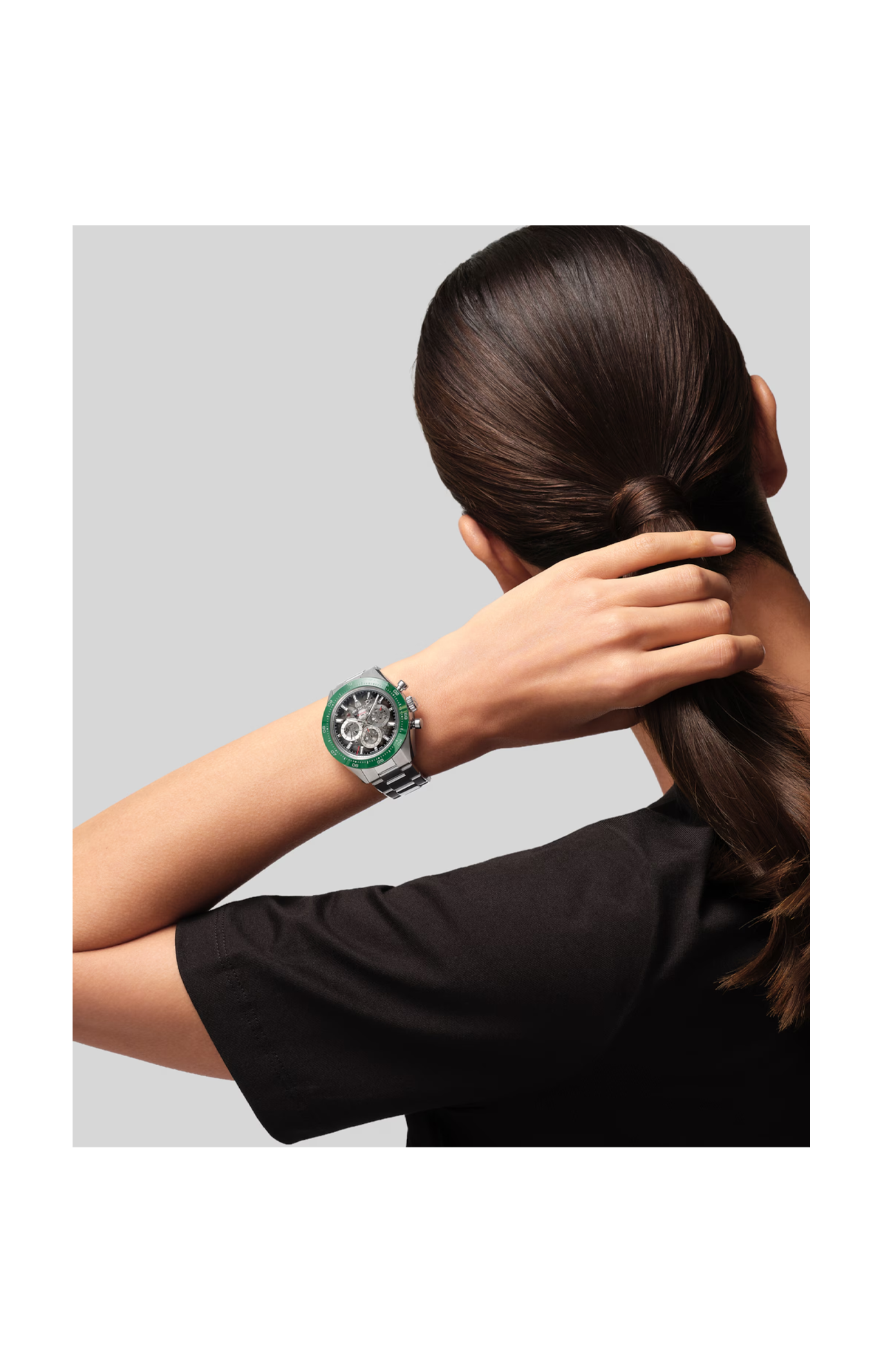 Il CHRONOMASTER Sport Skeleton con cassa da 41 mm in acciaio inossidabile unisce i classici pulsanti a pompa a una moderna lunetta in ceramica verde. Il quadrante in vetro zaffiro fumé con contatori in tre tonalità di grigio rivela il calibro scheletrato El Primero 3600 SK, un movimento cronografico automatico ad alta frequenza con ruota a colonne e una funzione cronografica che misura i decimi di secondo. Fornito con un bracciale in acciaio con fibbia déployante regolabile ultra confortevole e un cinturino aggiuntivo in caucciù verde.