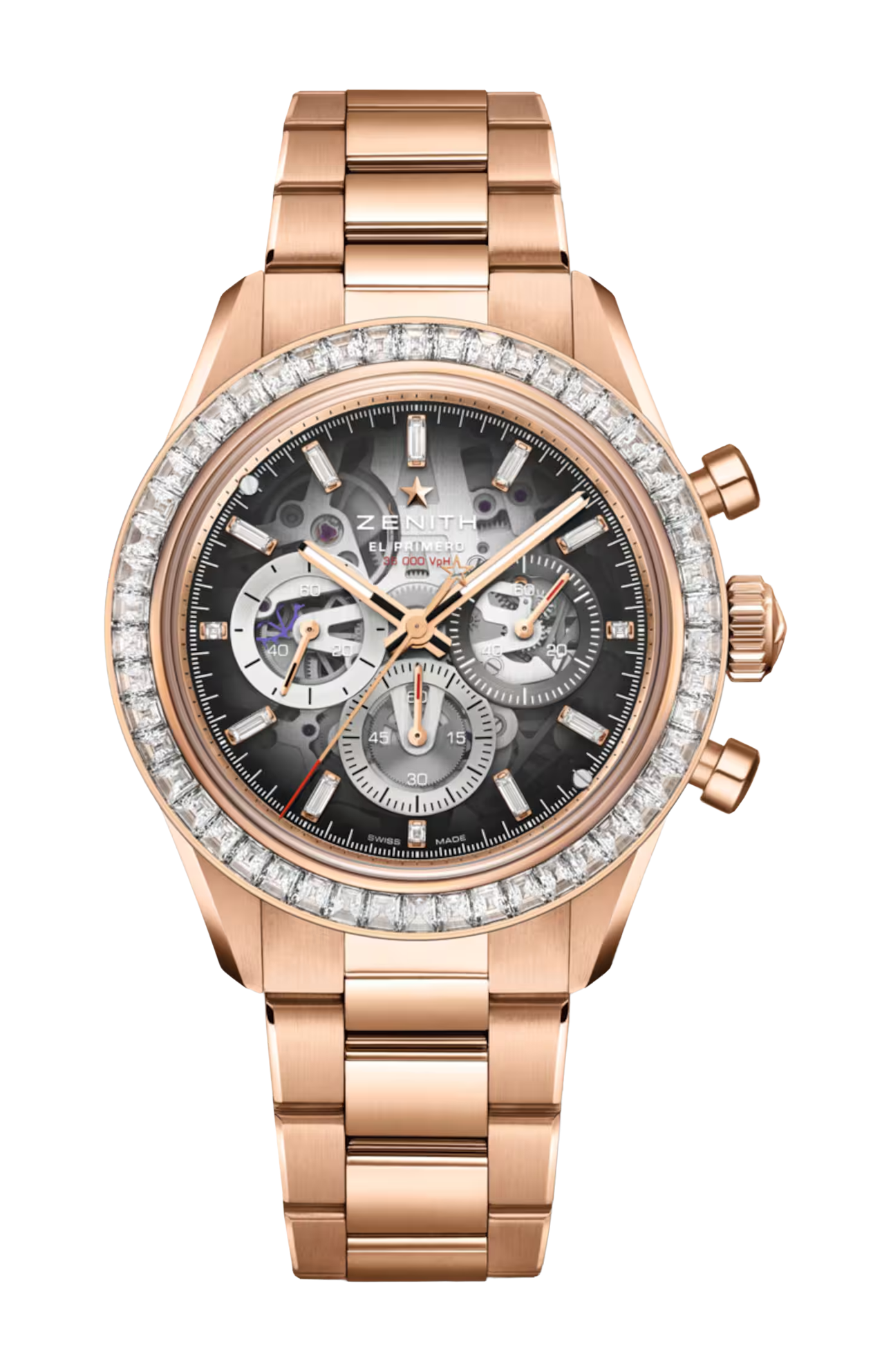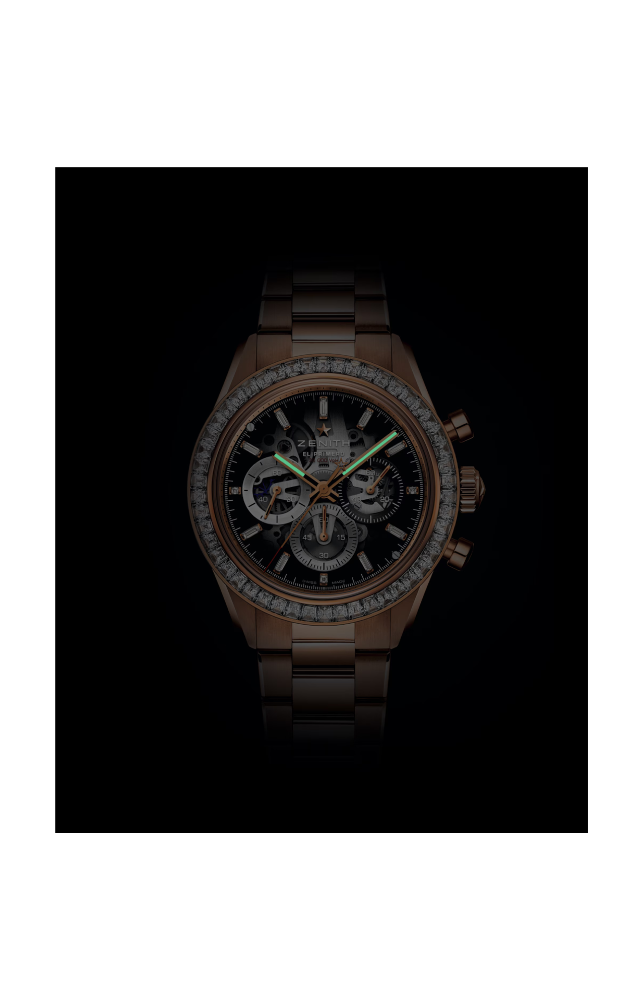 Massima espressione del lusso, questo Chronomaster Sport Skeleton in edizione limitata in oro rosa 18 carati è impreziosito da una straordinaria lunetta tempestata di diamanti. Autentico esemplare da collezione, unisce la precisione impareggiabile di El Primero 3600 SK all’eccezionale maestria artigianale e all’esclusività, riflettendo lo spirito audace e pionieristico di ZENITH.