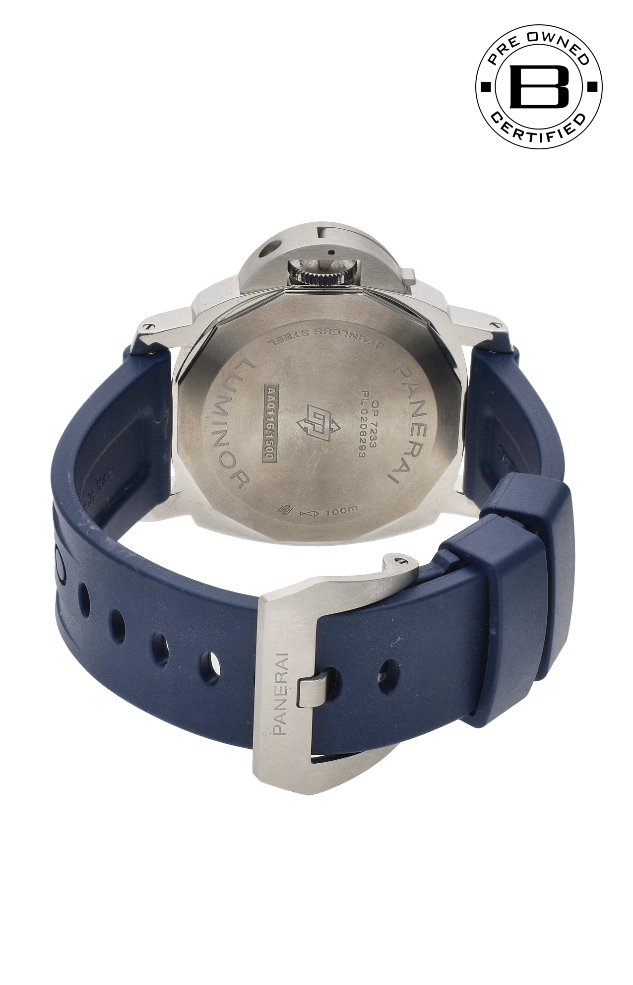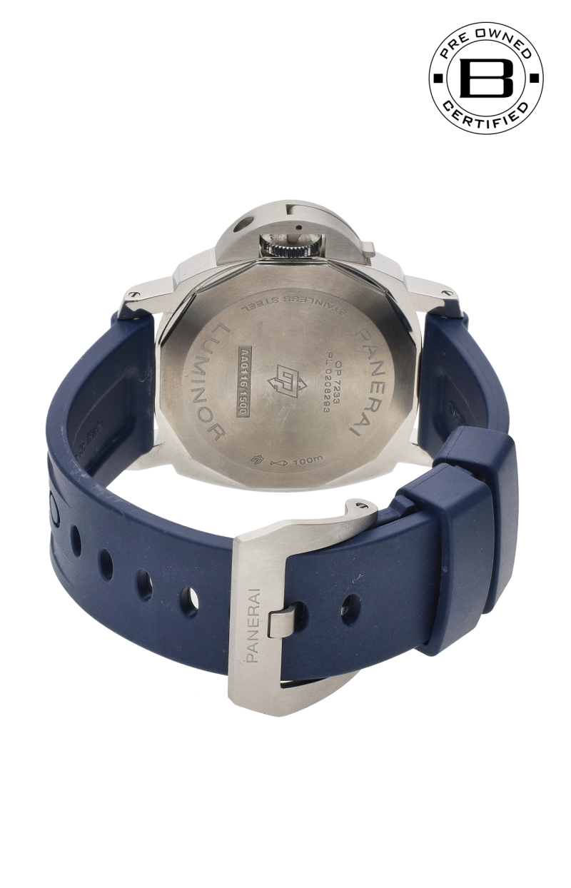 IL PANERAI LUMINOR BLU MARE 44 MM, REFERENZA PAM01085, È UN OROLOGIO CHE INCARNA LO SPIRITO MARINO E LA FORZA STILISTICA DEL MARCHIO OFFICINE PANERAI ATTRAVERSO UN DESIGN DECISO MA RAFFINATO: LA CASSA IN ACCIAIO AISI 316L DA 44 MM DI DIAMETRO E 13,05 MM DI SPESSORE, IMPREZIOSITA DA FINITURE LUCIDE E SATINATE, È COMPLETATA DAL CARATTERISTICO DISPOSITIVO A LEVA PER LA CORONA CHE GARANTISCE PROTEZIONE E RICONOSCIBILITÀ IMMEDIATA; IL FONDELLO È CHIUSO E A PRESSIONE, REALIZZATO ANCH’ESSO IN ACCIAIO SPAZZOLATO. IL QUADRANTE BLU “BLU MARE” CON DECORAZIONE SOLEIL-SPAZZOLATA OFFRE UNA PROFONDITÀ CROMATICA ELEGANTE, SUL QUALE SI STAGLIANO NUMERI ARABI E INDICI DIPINTI RIEMPITI DI SUPER-LUMINOVA VERDE PER LEGGIBILITÀ OTTIMALE ANCHE AL BUIO, LANCETTE RHODIATE, E UN PICCOLO SECONDINO AL 9. IL CALIBRO DI MANIFATTURA P.6000 È A CARICA MANUALE, DOTATO DI INCABLOC ANTI-URTO, CON FREQUENZA DI 21.600 ALTERNANZE/ORA E RISERVA DI CARICA DI CIRCA 72 ORE, ELEMENTO CHE UNISCE PRATICITÀ E FASCINO TRADIZIONALE. IL VETRO È ZAFFIRO PER GARANTIRE RESISTENZA AI GRAFFI, IL FONDELLO SOLIDO PROTEGGE IL MECCANISMO, E L’IMPERMEABILITÀ FINO A 10 BAR (100 METRI) RENDE L’OROLOGIO ADATTO ANCHE A CHI VUOLE AFFIDABILITÀ IN SITUAZIONI D’USO QUOTIDIANO. IL CINTURINO IN PELLE DI VITELLO BLU CON CUCITURE BEIGE CONFERISCE UN TOCCO DI ELEGANZA, MENTRE NELLA CONFEZIONE È INCLUSO ANCHE UN CINTURINO IN GOMMA BLU PER MAGGIORE VERSATILITÀ. QUESTO MODELLO È PERFETTO PER CHI DESIDERA UN SEGNATEMPO DISTINTIVO, CON FORTE PERSONALITÀ, CHE CONIUGA HERITAGE ITALIANO, MECCANICA ECCELLENTE E STILE MARINO CON CHARME CONTEMPORANEO.