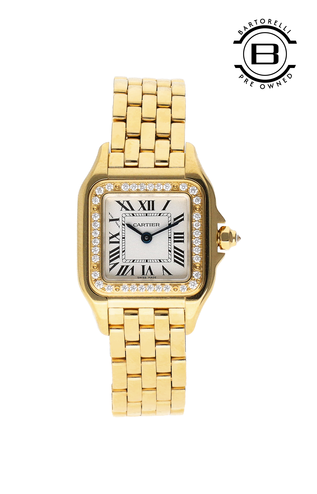 OROLOGIO PANTHÈRE DE CARTIER, MODELLO PICCOLO, MOVIMENTO A QUARZO. CASSA IN ORO GIALLO 750/1000 ORNATA DI DIAMANTI TAGLIO BRILLANTE, DIMENSIONI 22 X 30 MM, SPESSORE 6 MM, CORONA ORNATA DI UN DIAMANTE, QUADRANTE ARGENTATO, LANCETTE A FORMA DI GLADIO D'ACCIAIO AZZURRATO, BRACCIALE IN ORO GIALLO 750/1000, IMPERMEABILE FINO A 30 METRI.