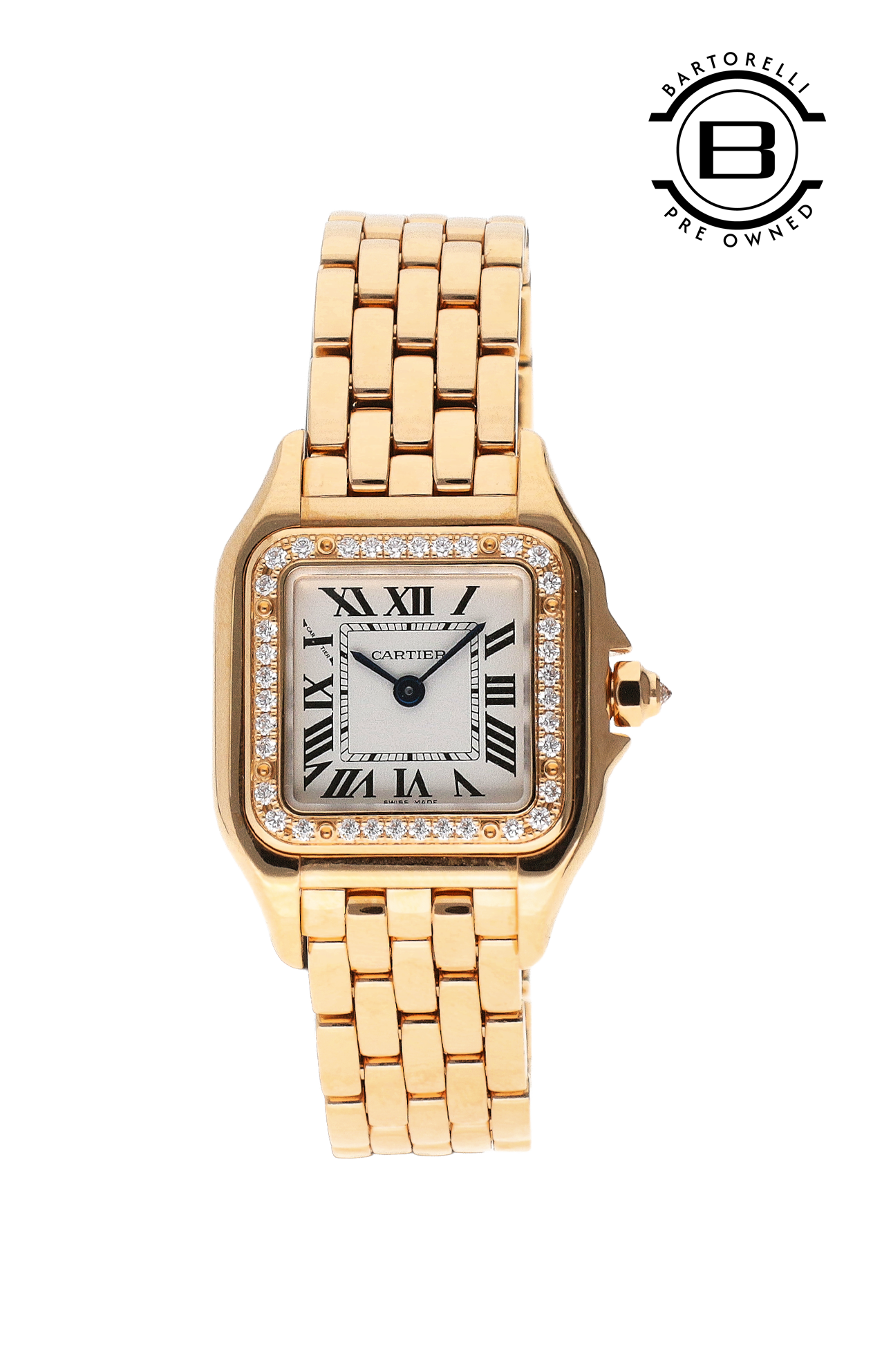 OROLOGIO PANTHÈRE DE CARTIER, MODELLO PICCOLO, MOVIMENTO A QUARZO. CASSA IN ORO ROSA 750/1000 ORNATA DI DIAMANTI TAGLIO BRILLANTE, DIMENSIONI 22 X 30 MM, SPESSORE 6 MM, CORONA ORNATA DI UN DIAMANTE, QUADRANTE ARGENTATO, LANCETTE A FORMA DI GLADIO D'ACCIAIO AZZURRATO, BRACCIALE IN ORO ROSA 750/1000, IMPERMEABILE FINO A 30 METRI.