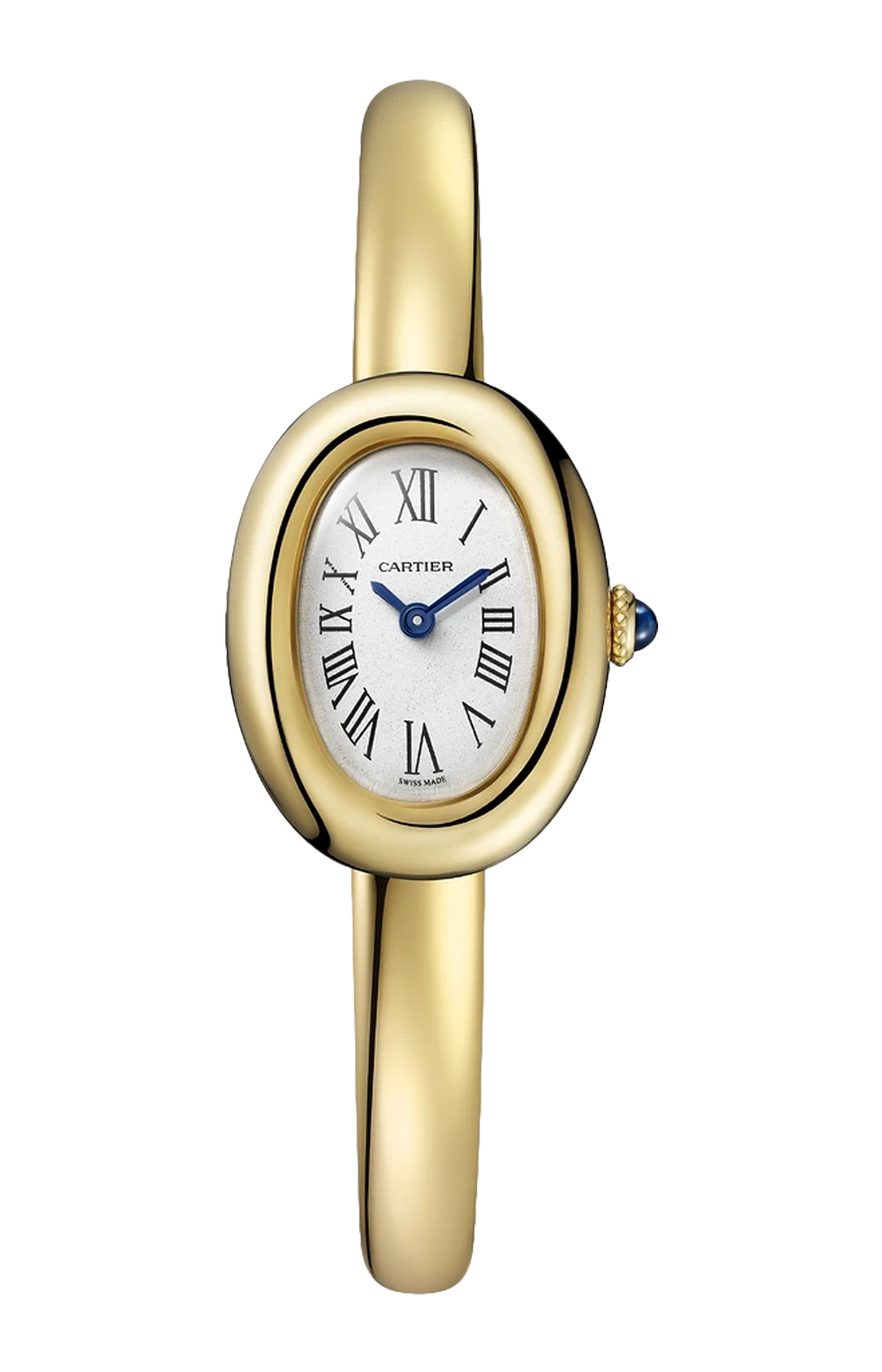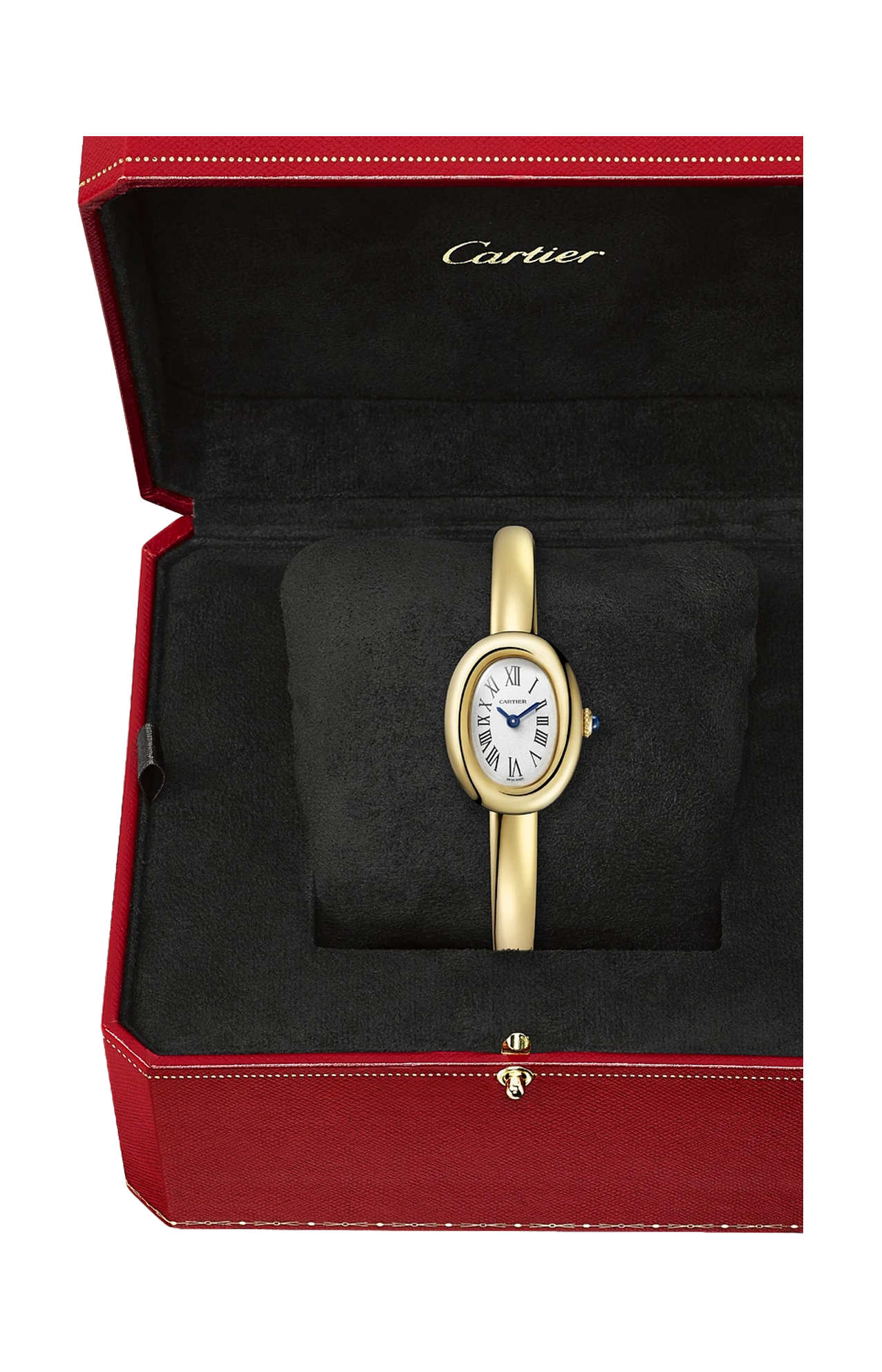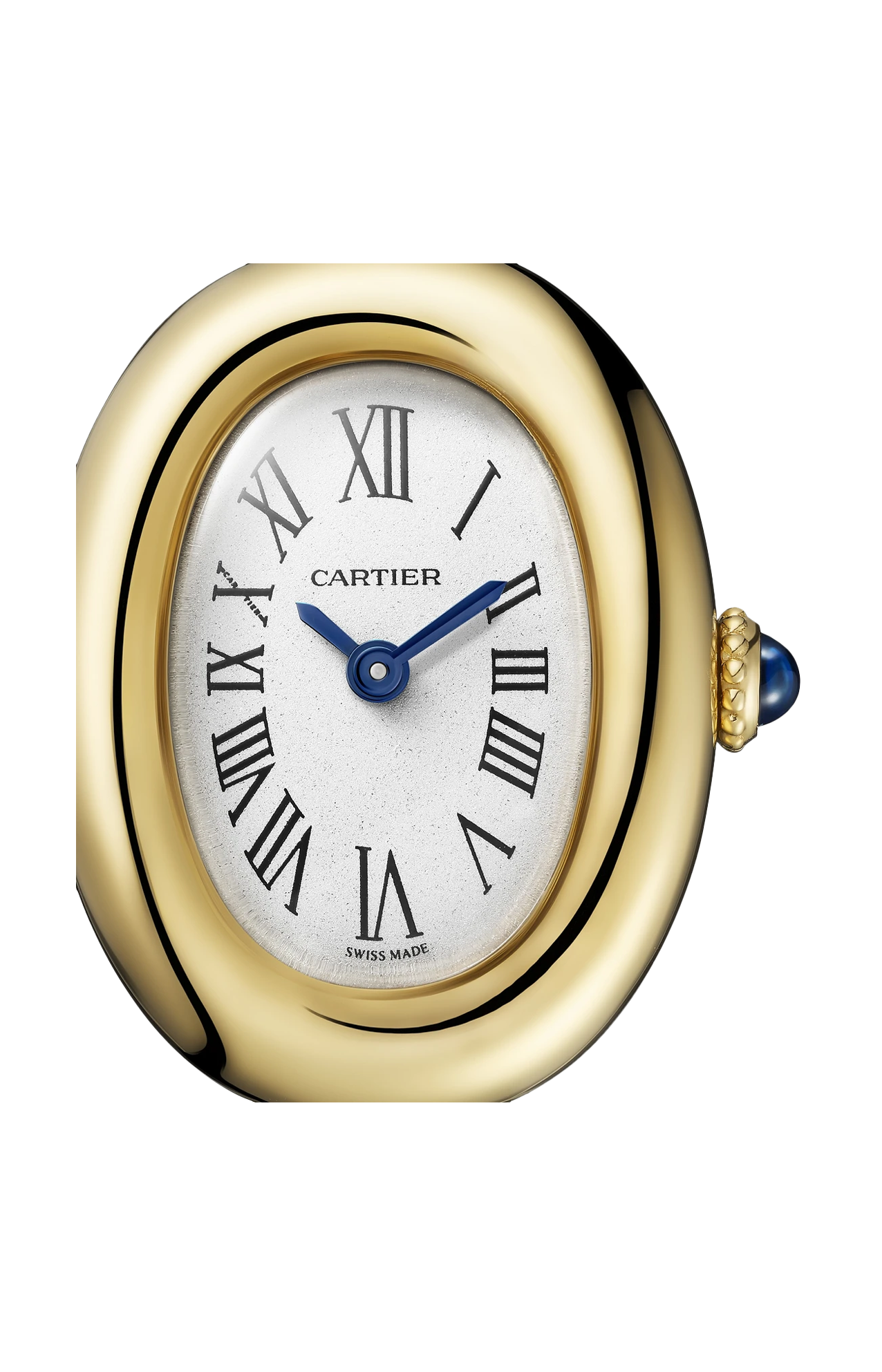 Orologio Baignoire de Cartier, modello mini, movimento al quarzo. Cassa in oro giallo 750/1000. Corona perlata in oro giallo 750/1000 ornata di uno zaffiro cabochon. Quadrante argentato, lancette a forma di gladio d’acciaio azzurrato, vetro zaffiro. Bracciale rigido in oro giallo 750/1000. Dimensioni della cassa 24,6 x 18,7 mm, spessore 7,2 mm. Impermeabile fino a 30 metri.