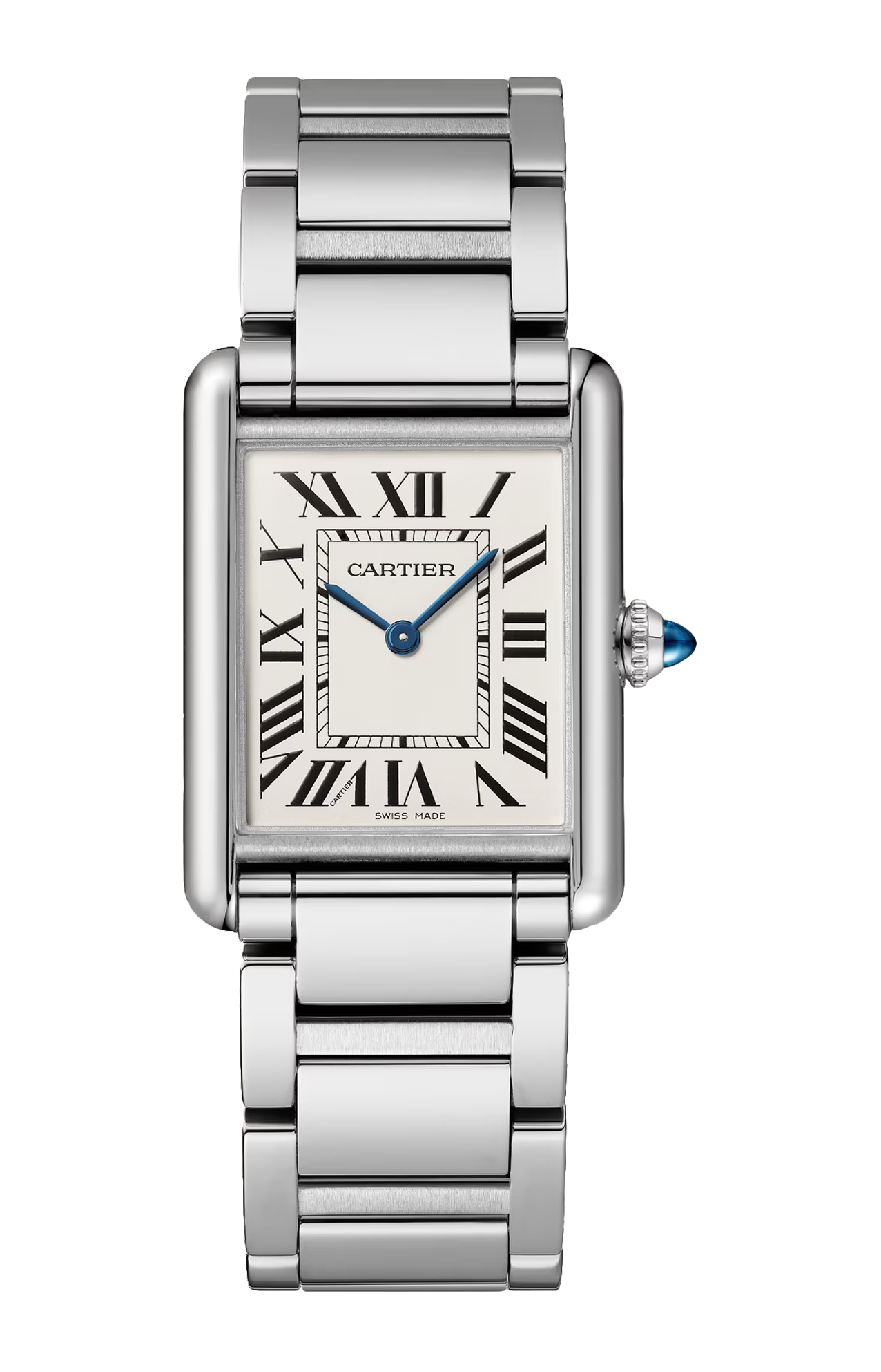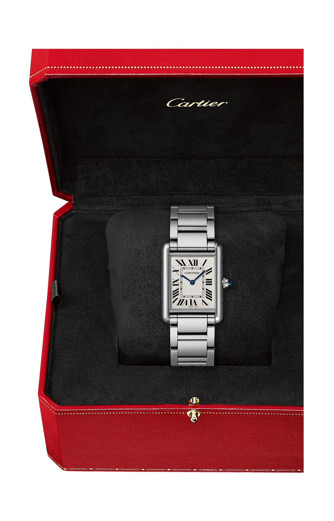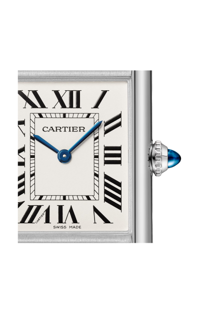 Orologio Tank Must, modello grande, movimento al quarzo ad alta autonomia. Cassa in acciaio, corona perlata ornata di uno spinello sintetico cabochon, quadrante argentato, lancette a forma di gladio in acciaio azzurrato, bracciale in acciaio. Dimensioni della cassa: 33,7 x 25,5 mm, spessore: 6,6 mm. Impermeabile fino a 30 metri. Louis Cartier crea l'orologio Tank nel 1917. Nasce una leggenda. Il primo prototipo viene regalato al generale Pershing qualche anno prima della sua commercializzazione, avvenuta nel 1919. La sua estetica unica è dovuta agli attacchi nascosti sotto alle stanghette laterali verticali dagli spigoli a vivo. La purezza delle sue linee sedurrà gli spiriti liberi ed eleganti. Divenuto un'icona, l'orologio Tank ha dato vita a numerose varianti, senza mai snaturare la sua forte identità.