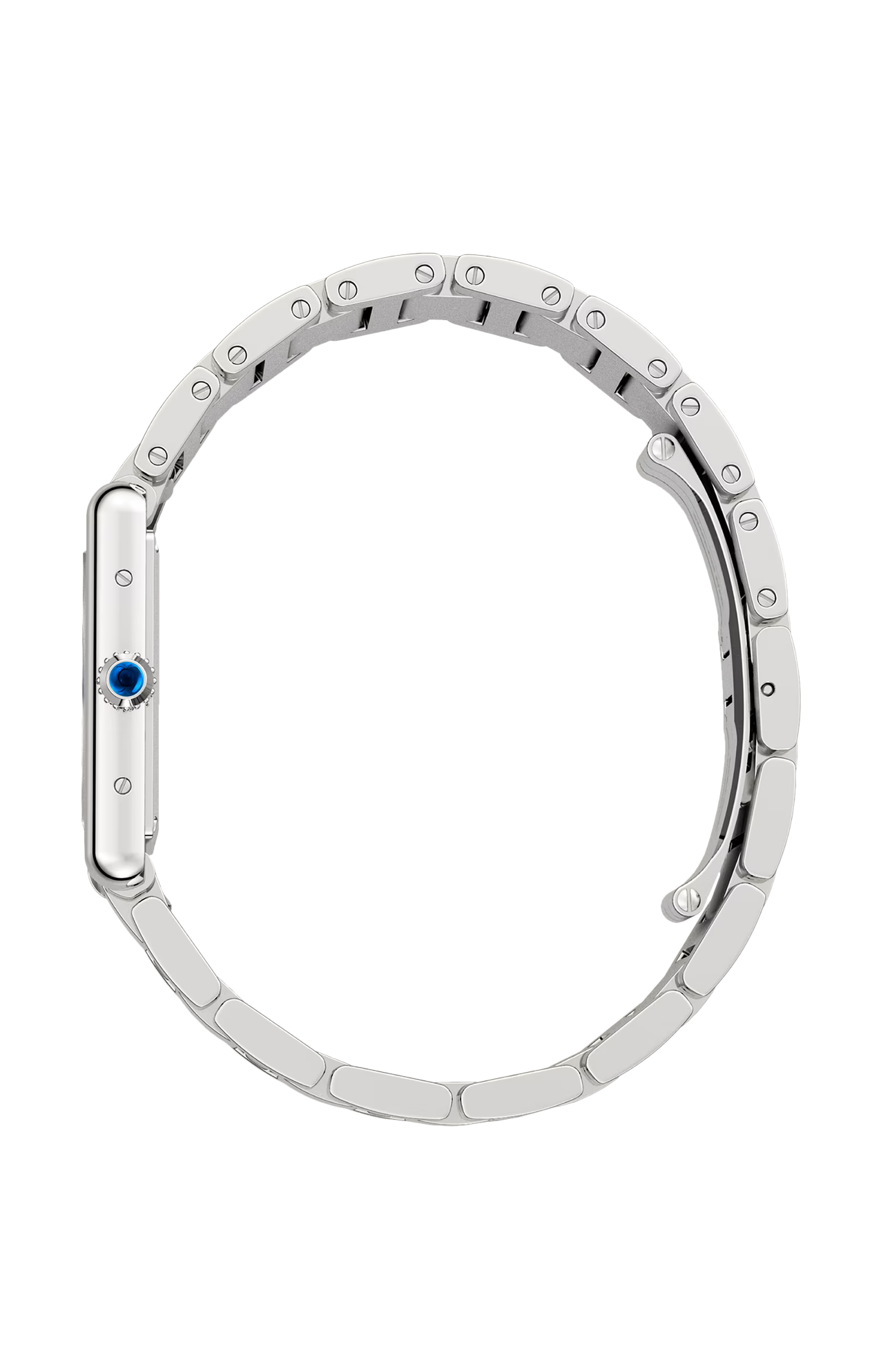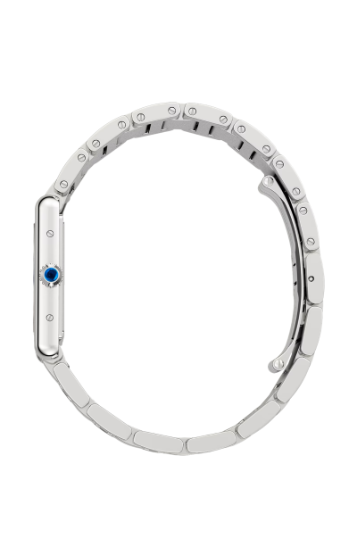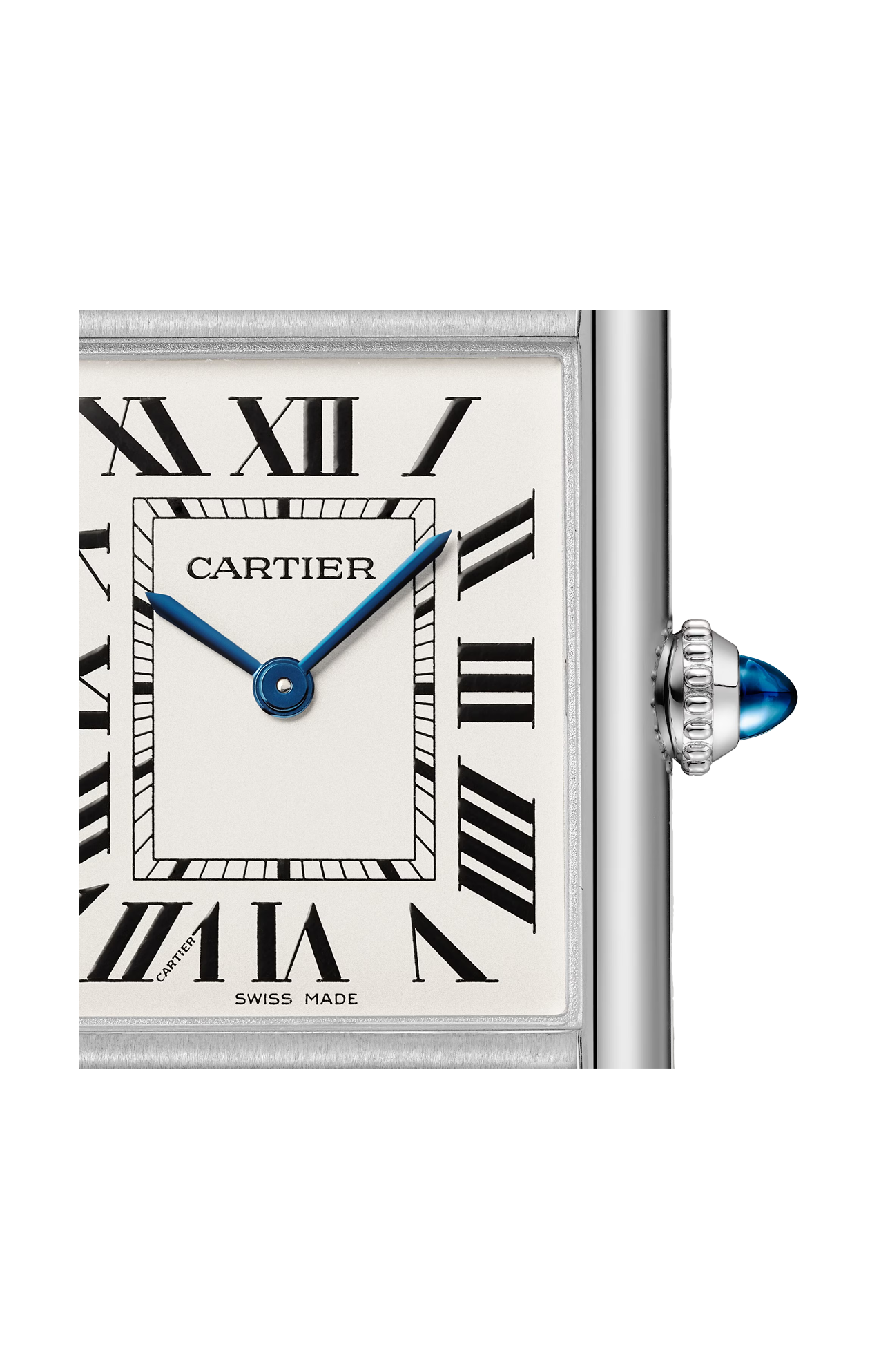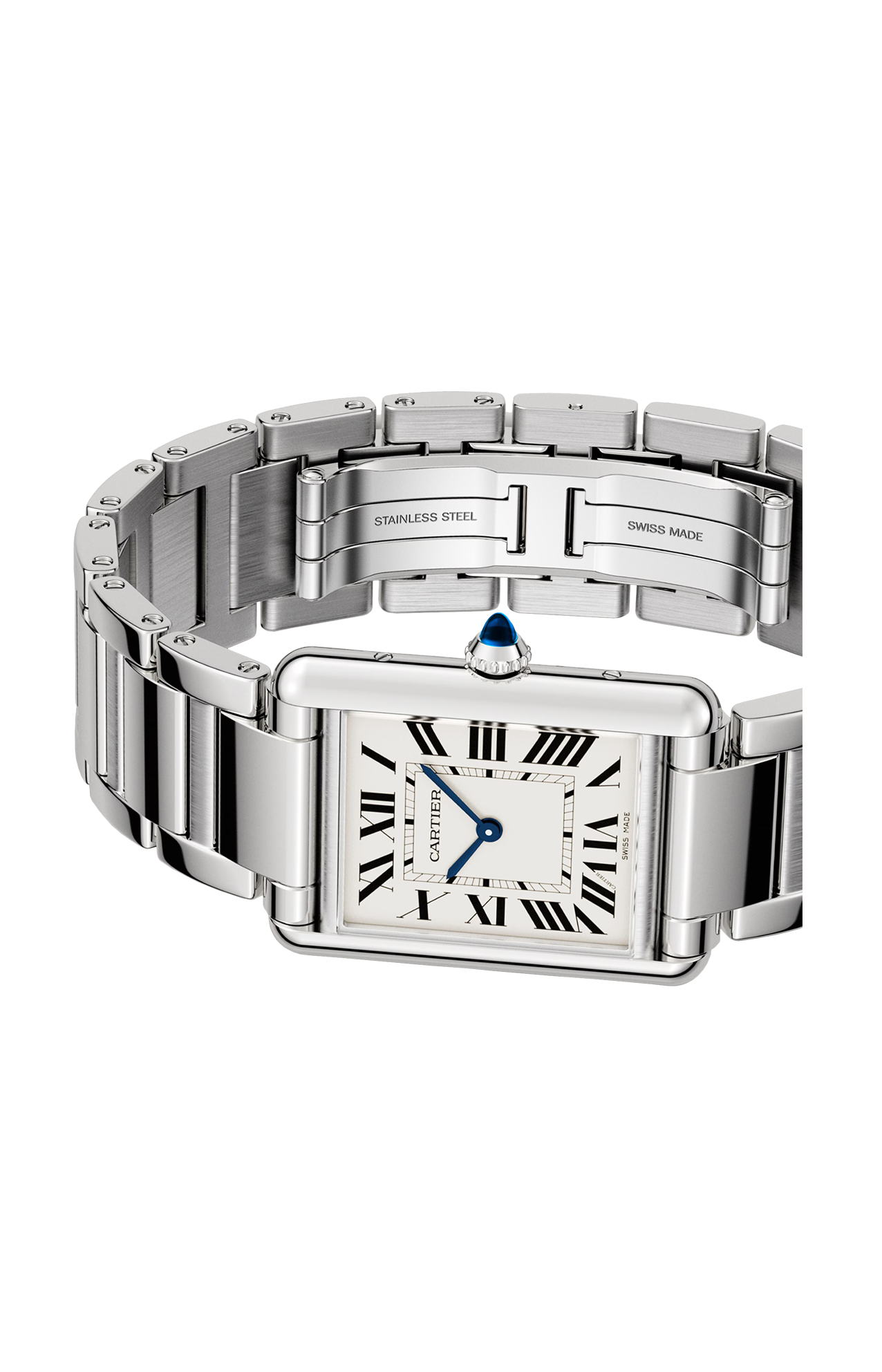Orologio Tank Must, modello grande, movimento al quarzo ad alta autonomia. Cassa in acciaio, corona perlata ornata di uno spinello sintetico cabochon, quadrante argentato, lancette a forma di gladio in acciaio azzurrato, bracciale in acciaio. Dimensioni della cassa: 33,7 x 25,5 mm, spessore: 6,6 mm. Impermeabile fino a 30 metri. Louis Cartier crea l'orologio Tank nel 1917. Nasce una leggenda. Il primo prototipo viene regalato al generale Pershing qualche anno prima della sua commercializzazione, avvenuta nel 1919. La sua estetica unica è dovuta agli attacchi nascosti sotto alle stanghette laterali verticali dagli spigoli a vivo. La purezza delle sue linee sedurrà gli spiriti liberi ed eleganti. Divenuto un'icona, l'orologio Tank ha dato vita a numerose varianti, senza mai snaturare la sua forte identità.