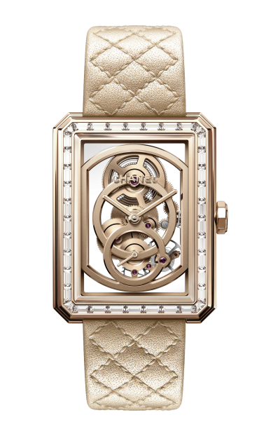 L’orologio CHANEL Boy·Friend Squelette Ref. H6594 è un segnatempo di alta orologeria che unisce estetica contemporanea e tecnica sofisticata, espressione perfetta della visione moderna di CHANEL. La cassa tondeggiante ma definita da linee decise è realizzata in ORO BEIGE 18 carati, offrendo presenza e stile con un carattere deciso ma elegante. La lunetta è in ORO BEIGE 18 carati con 38 diamanti taglio brillante (~1,58 carati). Il quadrante scheletrato lascia scorgere l’architettura interna del movimento, valorizzando il gioco meccanico con un’estetica audace e trasparente che incarna la fusione tra design e ingegneria di precisione. Le lancette e gli elementi applicati risultano leggibili nonostante la grafica aperta, creando un equilibrio visivo elegante e moderno. Il movimento Calibro 3 a carica manuale ≈ 55 ore riflette il savoir-faire orologiero svizzero con finiture curate nei dettagli visibili attraverso il vetro zaffiro. Il vetro zaffiro antigraffio con trattamento antiriflesso protegge e mette in valore ogni elemento visivo, mentre il cinturino in pelle marrone dorato motivo matelassé con sistema intercambiabile e tripla chiusura pieghevole in ORO BEIGE 18 carati con 23 diamanti taglio baguette (~0,92 carati) assicura comfort e stile. Con impermeabilità adatta all’uso quotidiano, il Boy·Friend Squelette è pensato per chi ama un orologio che sia tanto strumento di precisione quanto dichiarazione di design, incarnando l’essenza di eleganza contemporanea, modernità e innovazione firmata CHANEL.