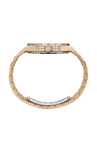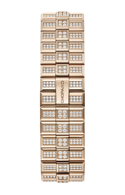 LA COLLEZIONE DI OROLOGI SPORTY-CHIC DI CHOPARD, ISPIRATA ALLA GRAZIA DELL’AQUILA E ALLA MAESTÀ DELLE ALPI, ACCOGLIE IL SEGNATEMPO IN ORO CON DIAMANTI ALPINE EAGLE FROZEN. LA CASSA DI 41 MM DI DIAMETRO E IL BRACCIALE INTEGRATO, IN ORO ETICO ROSA 18 CARATI, SONO INTERAMENTE RICOPERTI DI UN PAVÉ DI DIAMANTI TAGLIO BRILLANTE, MENTRE SULLA LUNETTA SCINTILLANO I DIAMANTI TAGLIO TRAPEZIO. QUESTA VERSIONE GIOIELLO DELL’OROLOGIO DEDICATO ALLE “AQUILE CONTEMPORANEE”, LA CUI PERIZIA TECNICA È PARI SOLO ALLA RAFFINATEZZA ESTETICA, OSPITA IL MOVIMENTO CHOPARD 01.03-C A CARICA AUTOMATICA CON 60 ORE DI RISERVA DI CARICA. GRAZIE ALLA RICCHEZZA DEI SUOI DIAMANTI CHE RICORDANO I DELICATI CRISTALLI DI NEVE SULLE CIME DELLE ALPI, QUESTO LUSSUOSO OROLOGIO DI DIAMANTI SCINTILLA DI UN’AURA ETICA E RESPONSABILE.