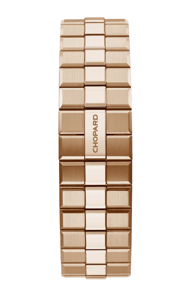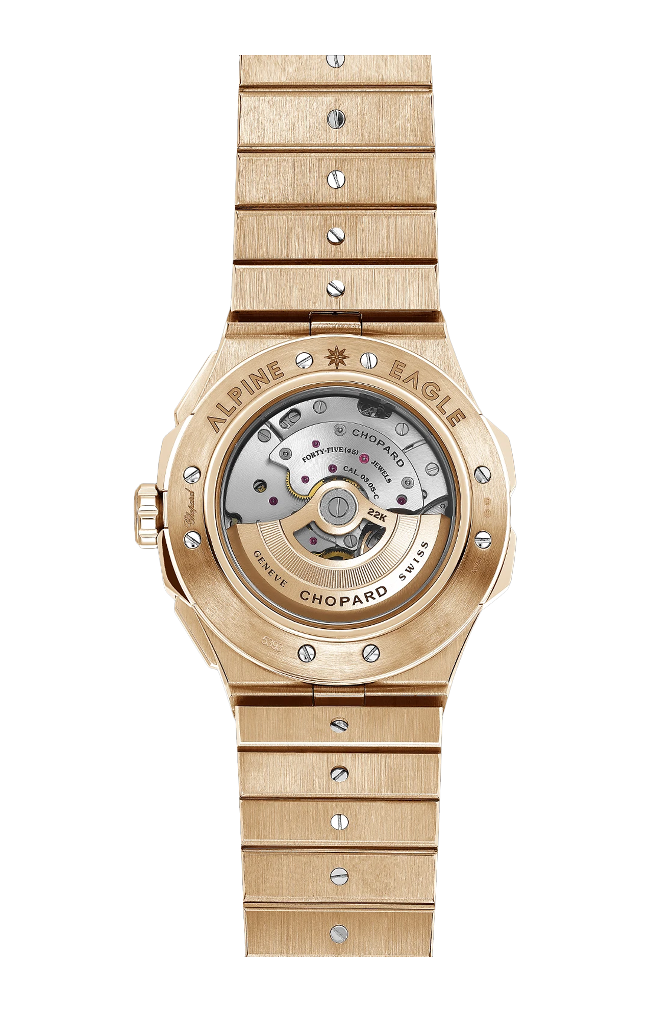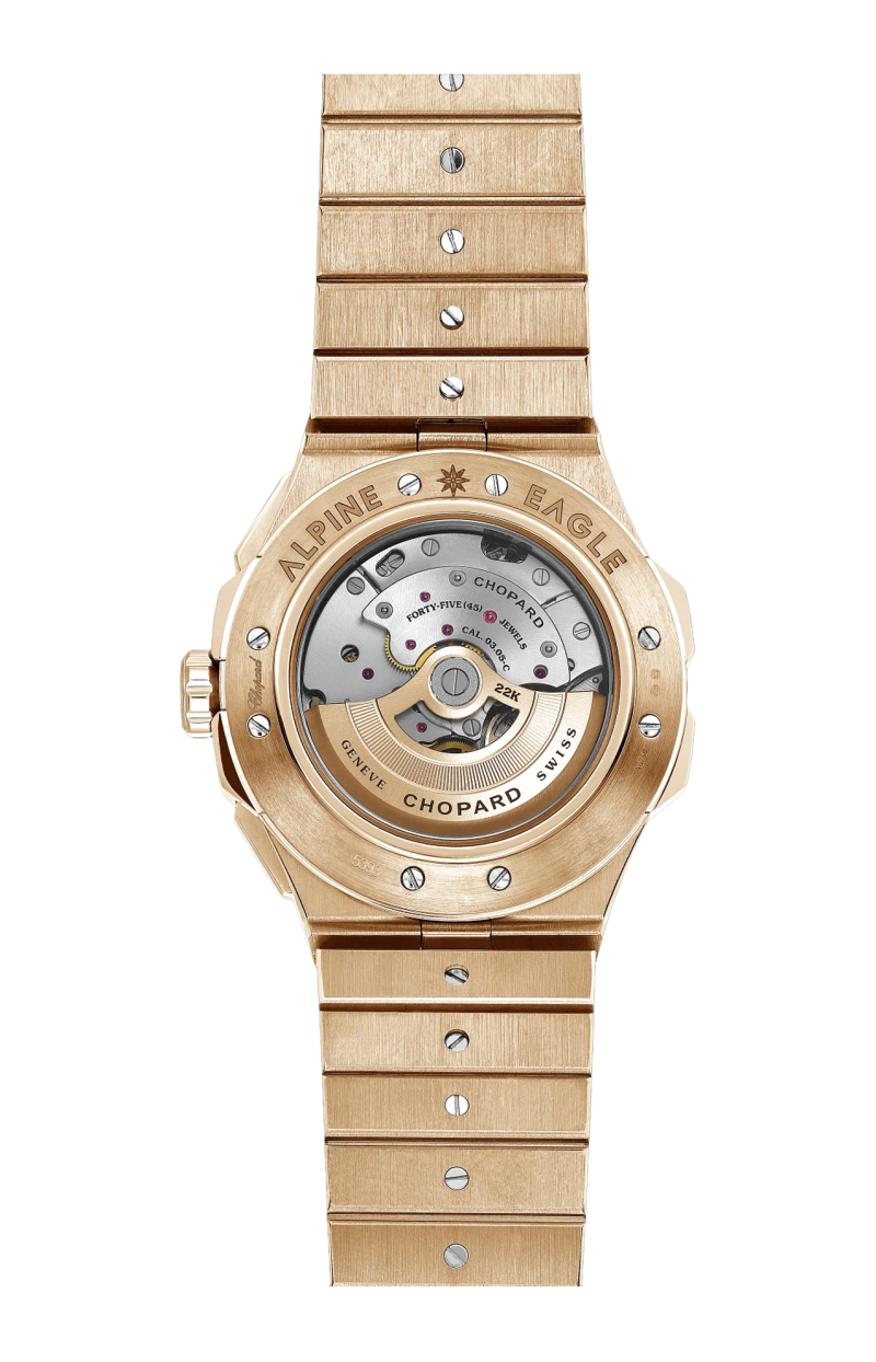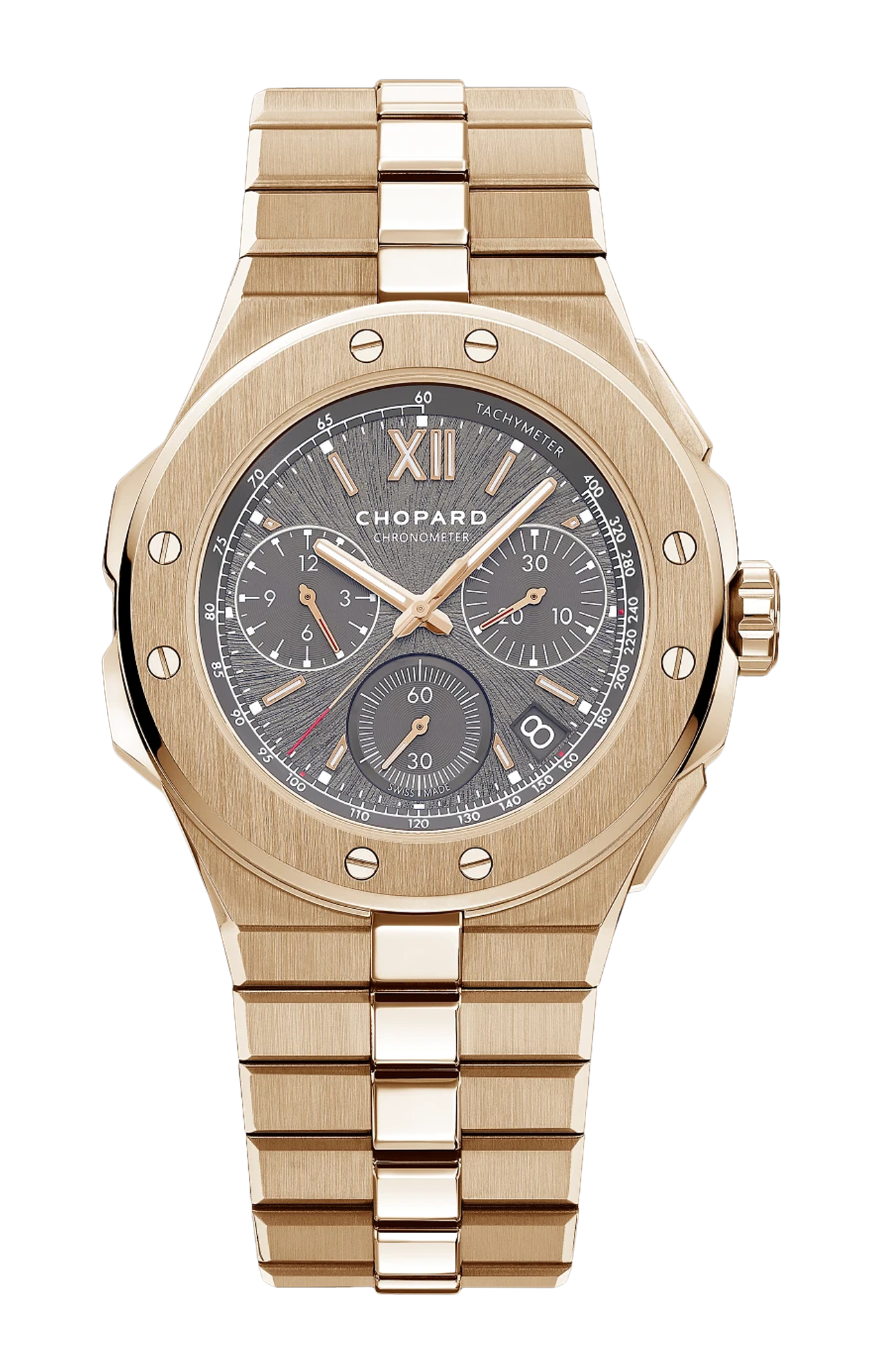 LA COLLEZIONE ALPINE EAGLE DECLINA IL SUO CRONOGRAFO CON FUNZIONE FLYBACK IN UN MODELLO DI 44 MILLIMETRI DI DIAMETRO INTERAMENTE REALIZZATO IN ORO ETICO ROSA 18 CARATI. QUESTO MODELLO, ALLA STREGUA DELL’INTERA COLLEZIONE, SI ISPIRA ALLA FORZA DELL’AQUILA E ALLA BELLEZZA DELLE ALPI. IL QUADRANTE “GRIGIO BERNINA” È UN OMAGGIO AL COLORE DELLA ROCCIA ALPINA. IL MOVIMENTO AUTOMATICO CON FUNZIONE FLYBACK CHOPARD 03.05-C CHE OSPITA È CERTIFICATO CRONOMETRO E HA DATO LUOGO A TRE BREVETTI CHE NE ATTESTANO LA PRECISIONE E L’UTILIZZO SEMPLIFICATO.