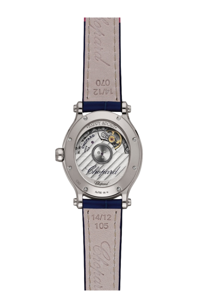 Visione di modernità e spirito libero la collezione Happy Sport accoglie un modello ovale estremamente elegante in oro bianco 18 carati. Reinventando il disegno ovale simbolo di abbondanza ed eternità, Chopard offre alle donne un orologio da usare come un talismano, per una vera promessa di gioia futura. Racchiudendo un movimento automatico sviluppato dalla Manifattura Chopard, l'orologio presenta un quadrante con finitura guilloché a mano tempestato di diamanti. Al tempo stesso tecnico e femminile, questo segnatempo è un vero orologio gioiello che racchiude sette iconici diamanti mobili. Edizione limitata a 25 esemplari.
