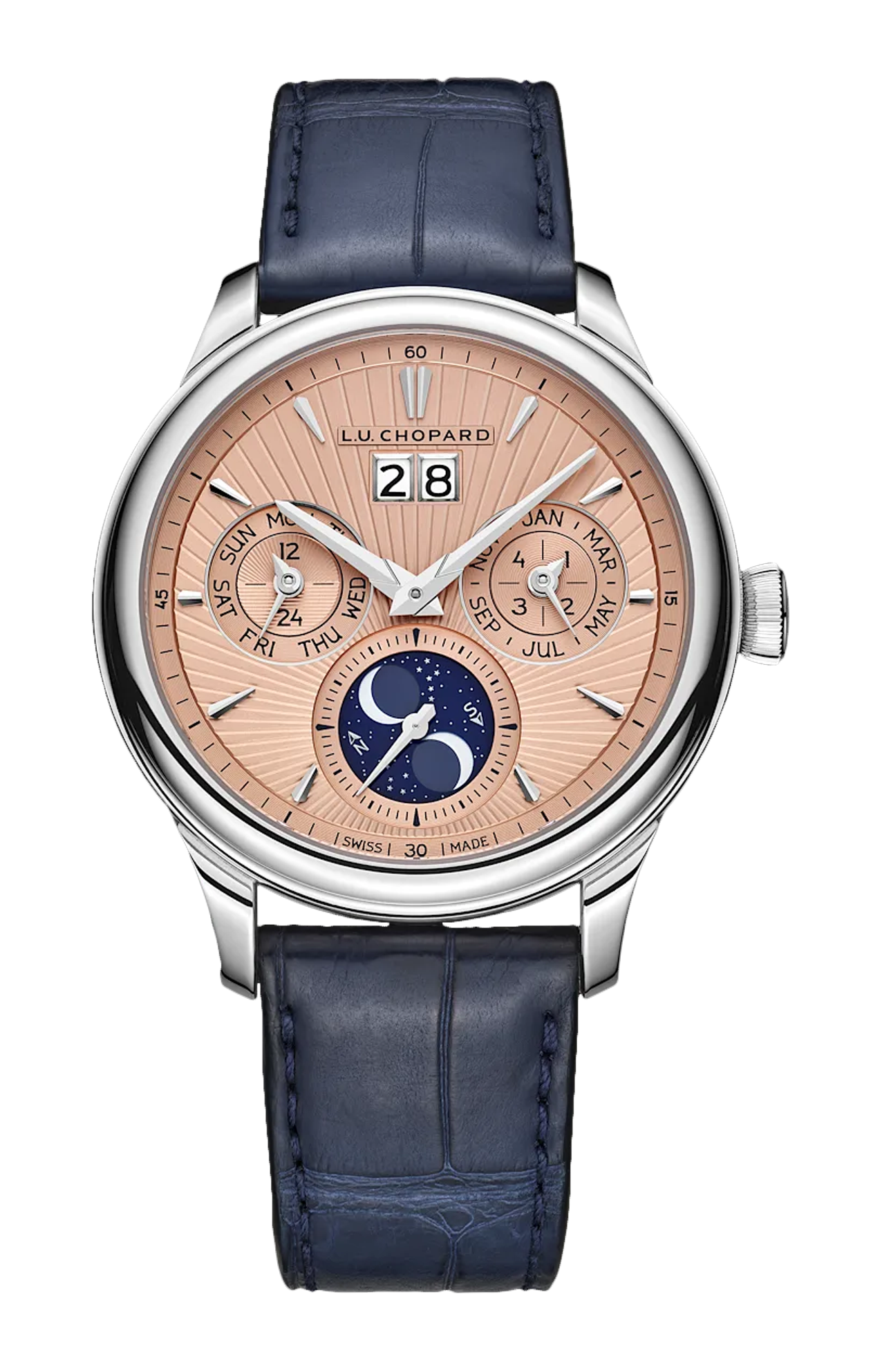 Presentato nel 2005 dalla manifattura Chopard come il primo modello con complicazione calendario, L.U.C Lunar One rimane l’unico segnatempo nella sua categoria dotato di una visualizzazione delle fasi lunari orbitali di precisione con finestrella rotante. Il movimento meccanico a carica automatica L.U.C calibro 96.13-L con calendario perpetuo e funzione astronomica delle fasi lunari, in grado di offrire un raro livello di precisione che garantisce una differenza di un solo giorno in 122 anni, anima due nuovi segnatempo il cui profilo è stato rivisitato in linea con la nuova estetica L.U.C. Racchiuso in una cassa in oro 18 carati da approvvigionamento responsabile del diametro di 40,5 mm, il quadrante è realizzato con una sapiente lavorazione guilloché eseguita a mano che si distingue per le indicazioni altamente leggibili, mentre l’ingegnoso sistema di cinturini intercambiabili offre una varietà di stili. Il movimento ha una precisione certificata come cronometro e le finiture di alta qualità dei due modelli L.U.C Lunar One hanno permesso ai segnatempo di ottenere il marchio di qualità del punzone di Ginevra.
