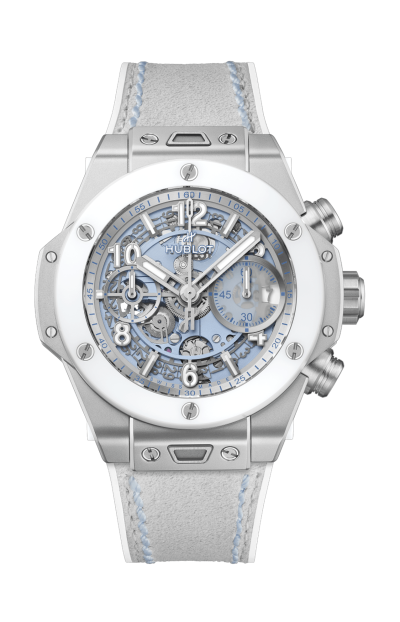 Per Hublot, i materiali sono parte integrante del design dei propri orologi. Devono completarli il design, proteggendone al contempo il meccanismo e resistendo alla prova del tempo. Per questo motivo, la manifattura ha scelto di utilizzare la ceramica high-tech per alcune lunette e casse; si tratta di un materiale ultraresistente e quasi completamente antigraffio (a parte il diamante), con una base di zirconio sinterizzato ad altissime temperature. Edizione limitata a 200 esemplari. Secondo cinturino incluso in caucciù bianco con inserti in pelle di vitello blu.