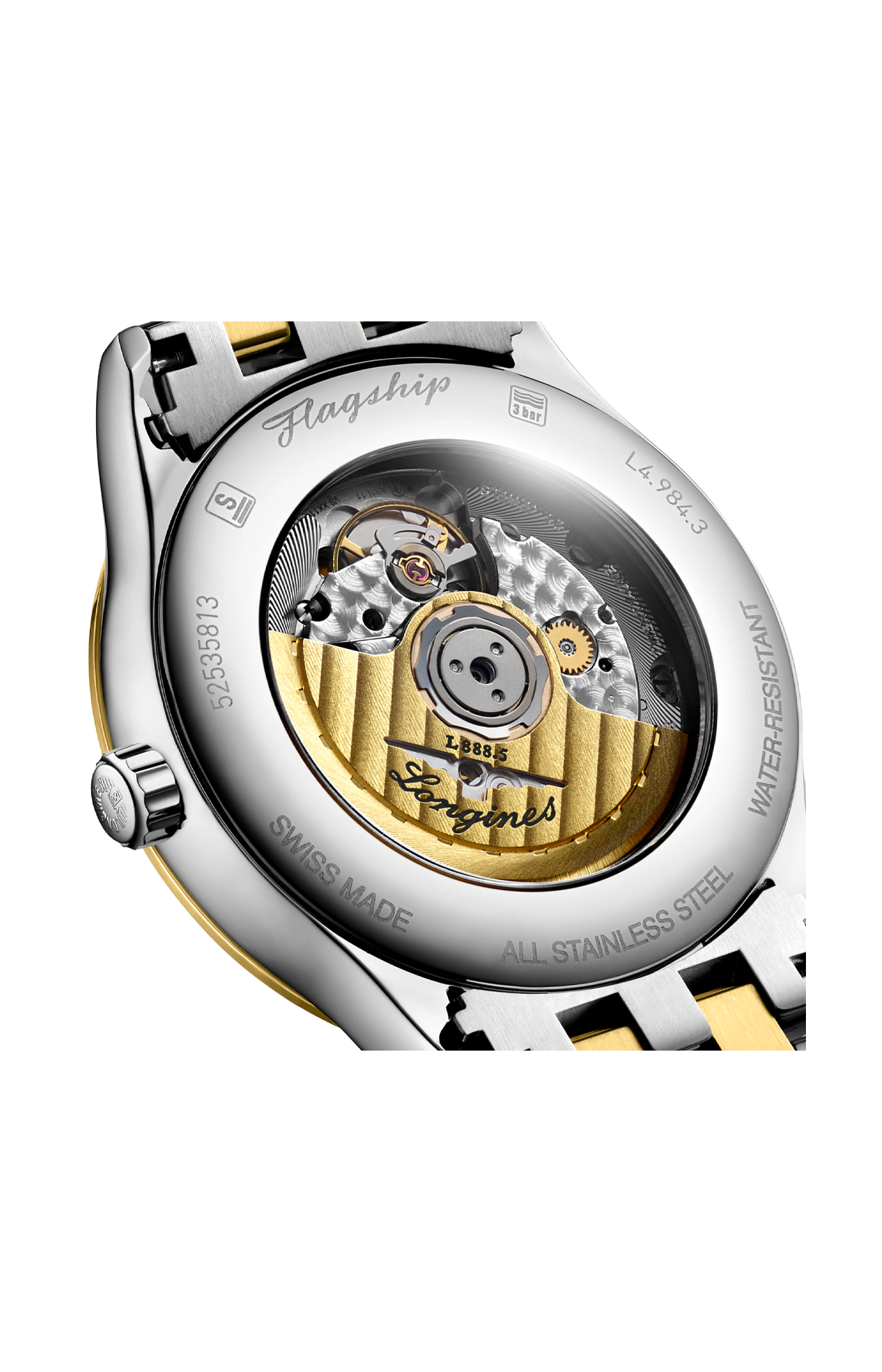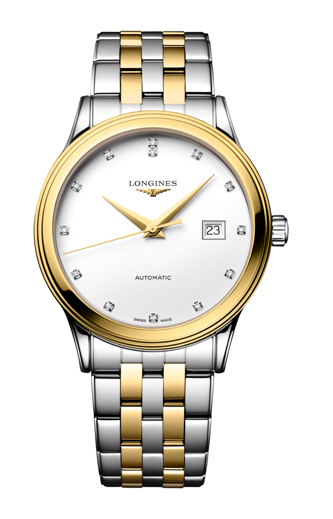 OROLOGIO AUTOMATICO, Ø 40.00 MM, ACCIAIO INOSSIDABILE E RIVESTIMENTO PVD GIALLO, L4.984.3.17.7 DATE, MOVIMENTO MECCANICO A CARICA AUTOMATICA CON FREQUENZA DI 25'200 ALTERNANZE ORARIE E RISERVA DI CARICA DI CIRCA 72 ORE, BILANCIERE-SPIRALE IN SILICIO MONOCRISTALLINO. IMPERMEABILE FINO A 3 BAR, VETRO ZAFFIRO ANTIGRAFFIO BOMBATO CON TRATTAMENTO ANTIRIFLESSO MULTISTRATO SUL LATO INTERNO. QUADRANTE BIANCO MAT. BRACCIALE IN ACCIAIO INOSSIDABILE E RIVESTIMENTO PVD GIALLO, CON CHIUSURA DÉPLOYANTE A TRIPLA SICUREZZA E MECCANISMO DI APERTURA A PRESSIONE.