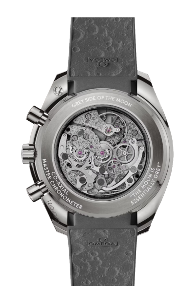 IL MOVIMENTO, APPOSITAMENTE DECORATO, È IL CALIBRO CO-AXIAL MASTER CHRONOMETER 3869 DI OMEGA, MENTRE LE INCISIONI SUL FONDELLO COMPRENDONO LA CITAZIONE, THE MOON IS ESSENTIALLY GREY, ATTRIBUITA AL PILOTA DEL MODULO DI COMANDO JIM LOVELL, DURANTE LA MISSIONE APOLLO 8.