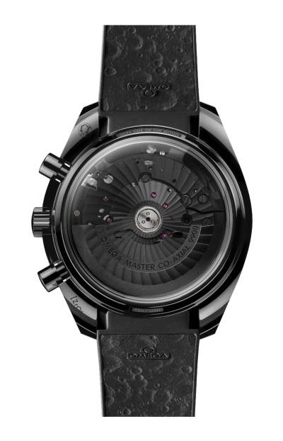 VISIBILE ATTRAVERSO IL FONDELLO, IL CALIBRO CO-AXIAL MASTER CHRONOMETER 9900 A CARICA AUTOMATICA DI OMEGA PRESENTA UNA SPECIALE FINITURA “BLACK EDITION”, CHE INCLUDE LA BRUNITURA OPACA DI ROTORE, PLATINA PRINCIPALE E PONTI, NONCHÉ INCISIONI LACCATE NERE. L’OROLOGIO È CORREDATO DA UN CINTURINO IN CAUCCIÙ NERO CON INTERNO DECORATO DA UN MOTIVO CHE RICHIAMA LA SUPERFICIE LUNARE, UNA FIBBIA DÉPLOYANTE IN CERAMICA E COMPONENTI INCERNIERATI A MOLLA REALIZZATI IN TITANIO CERAMIZZATO.