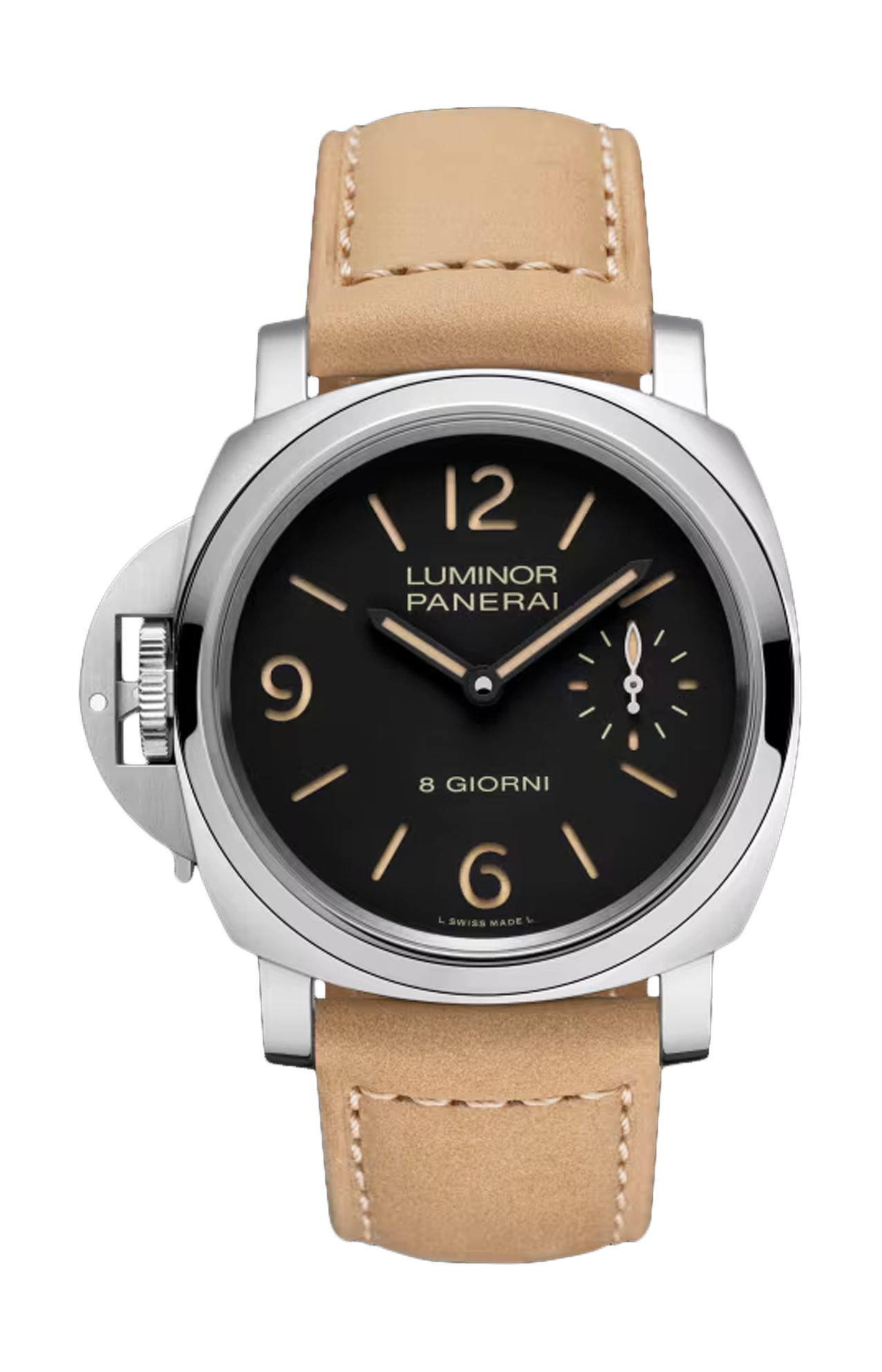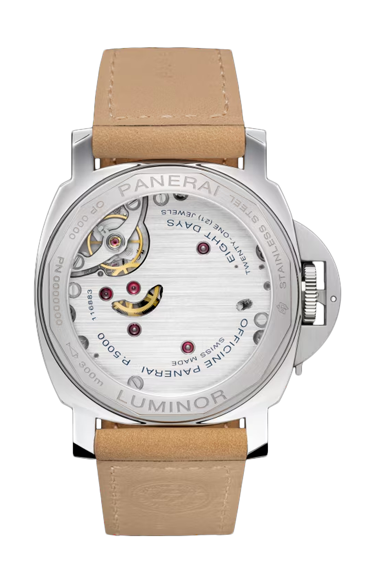 Il Panerai Luminor Destro Otto Giorni PAM01655 celebra lo spirito storico di innovazione della Maison con un layout "destro" studiato per chi indossa l'orologio al polso destro o semplicemente ama distinguersi, montando la corona al 9 ore e il dispositivo protettore tipico della collezione sul lato opposto rispetto al tradizionale. La cassa in acciaio lucido da 44 mm richiama il design iconico del modello, garantendo una forte presenza al polso e mantenendo il rigoroso standard di impermeabilità fino a 30 bar (~300 metri) per un uso quotidiano e sportivo senza compromessi. All'interno pulsa il movimento a carica manuale calibro P.5000, con due bariletti affiancati e una riserva di carica di ben 8 giorni ("8 Giorni" inciso sul quadrante), che offre comfort e affidabilità anche per chi lo porta per molti giorni consecutivi senza ricarica. Il quadrante nero in struttura "sandwich" e indici arabi e a bastone trattati in Super-LumiNova® beige garantiscono visibilità eccellente in ogni condizione, mentre il contatore dei piccoli secondi è posizionato in modo speculare a ore 3, in sintonia con la configurazione "destro". Il fondello è dotato di vetro zaffiro a vista che lascia ammirare il movimento finemente rifinito, e la lunetta in acciaio lucido dona un tocco elegante pur mantenendo l'identità robusta del modello. Il cinturino in pelle scamosciata chiara con fibbia trapezoidale in acciaio si abbina alla cassa con coerente eleganza, e l'orologio nell'insieme risulta ideale per chi desidera un segnatempo che coniughi la tradizione marina-militare di Panerai, la funzionalità tecnica e un carattere distintivo nel design.