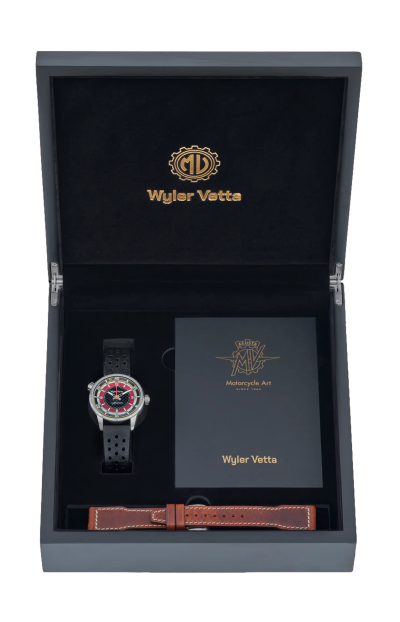 Il solo tempo Wyler Vetta in collaborazione con MV Agusta, così come il cronografo, riflette perfettamente lo stile della Superveloce 98 Edizione Limitata, la moto celebrativa degli 80 anni dal primissimo motore costruito dalla casa Varesina.