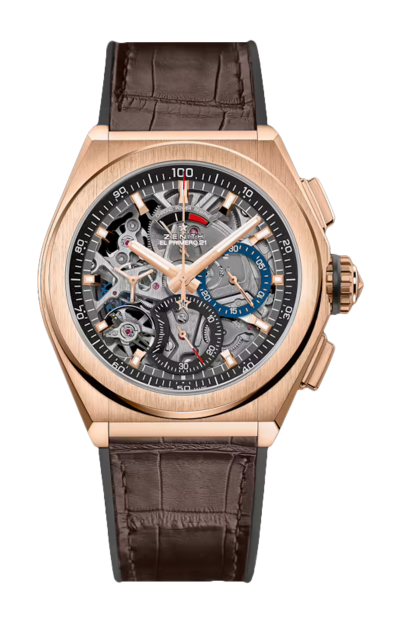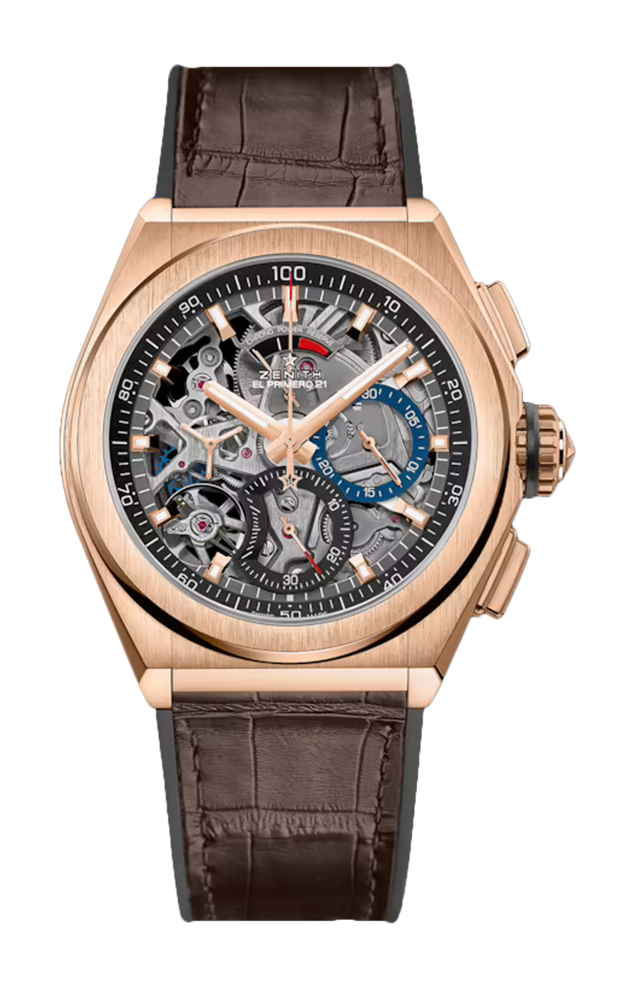 IL CRONOGRAFO AD ALTA FREQUENZA EL PRIMERO 21 CON PRECISIONE AL 1/100 DI SECONDO CON CASSA DEFY DA 44 MM IN ORO ROSA 18 CARATI E CINTURINO IN ALLIGATORE MARRONE E CAUCCIÙ NERO. IL SUO MOVIMENTO AUTOMATICO VANTA DUE SCAPPAMENTI INDIPENDENTI CHE OSCILLANO ALL’INCREDIBILE FREQUENZA DI 50 HZ PER LA FUNZIONE CRONOGRAFO E DI 5 HZ PER IL CRONOMETRAGGIO.