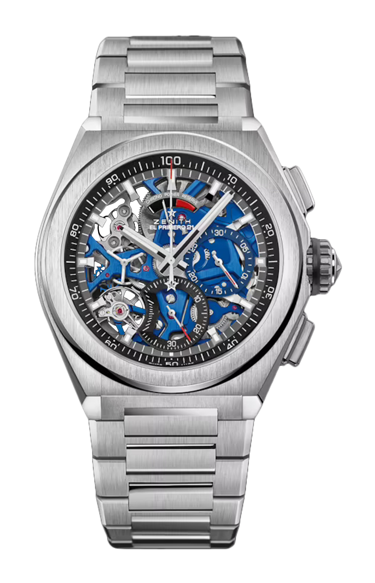 IL CRONOGRAFO AD ALTA FREQUENZA EL PRIMERO 21 CON PRECISIONE AL 1/100 DI SECONDO CON CASSA DEFY DA 44 MM IN TITANIO E BRACCIALE IN TITANIO ABBINATO. IL SUO MOVIMENTO AUTOMATICO BLU VANTA DUE SCAPPAMENTI INDIPENDENTI CHE OSCILLANO ALL’INCREDIBILE FREQUENZA DI 50 HZ PER LA FUNZIONE CRONOGRAFO E DI 5 HZ PER IL CRONOMETRAGGIO.