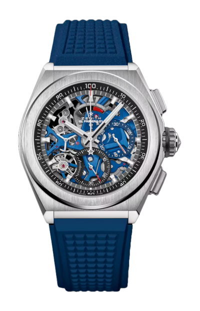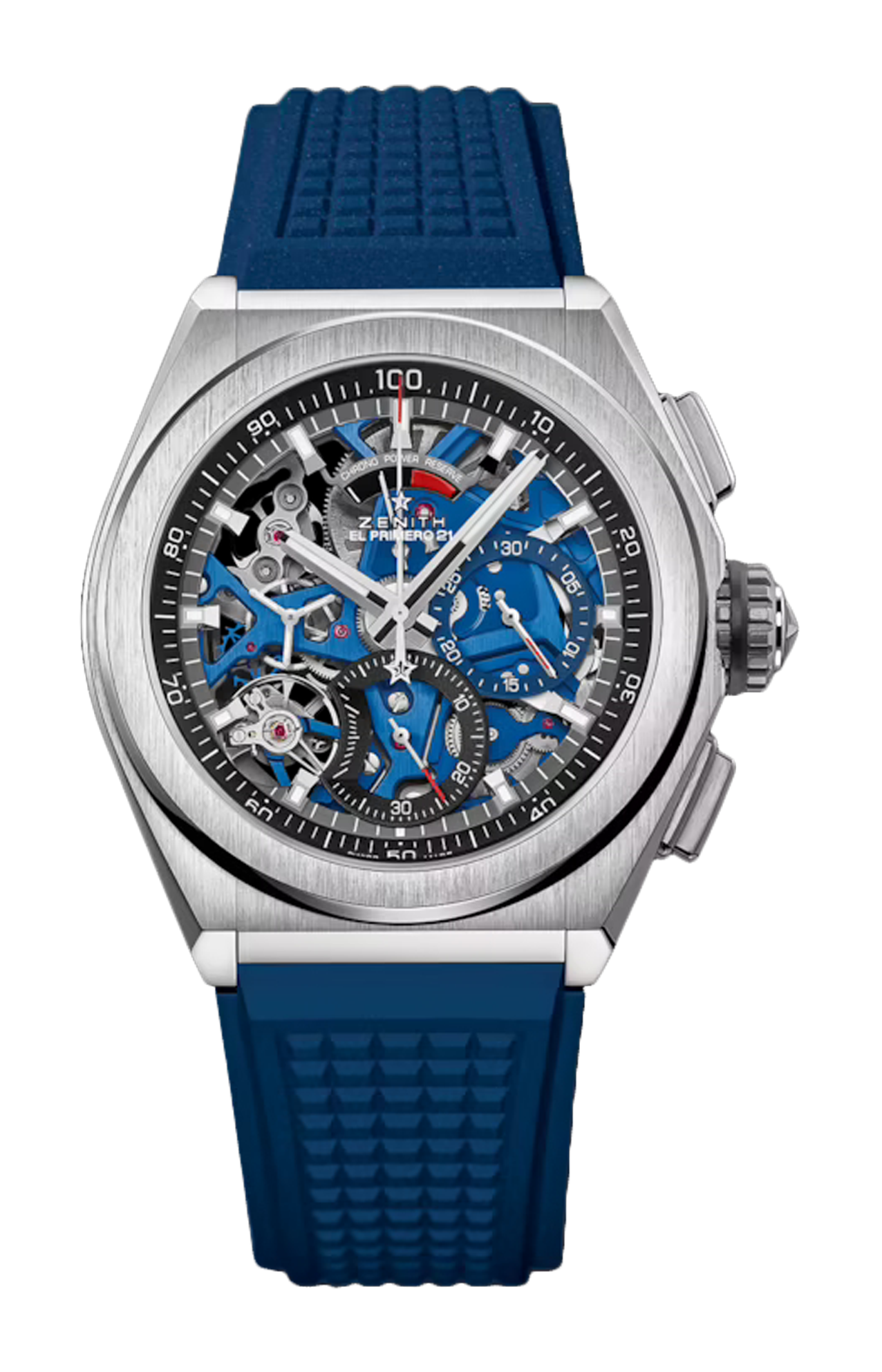 IL CRONOGRAFO AD ALTA FREQUENZA EL PRIMERO 21 CON PRECISIONE AL 1/100 DI SECONDO CON CASSA DEFY DA 44 MM IN TITANIO ABBINATO A UN CINTURINO IN CAUCCIÙ BLU TESTURIZZATO. IL SUO MOVIMENTO AUTOMATICO BLU VANTA DUE SCAPPAMENTI INDIPENDENTI CHE OSCILLANO ALL’INCREDIBILE FREQUENZA DI 50 HZ PER LA FUNZIONE CRONOGRAFO E DI 5 HZ PER IL CRONOMETRAGGIO.