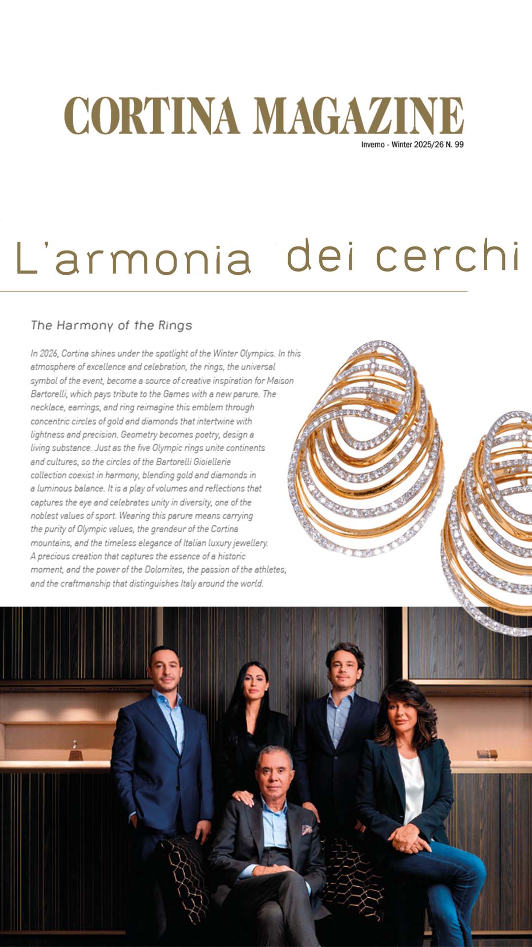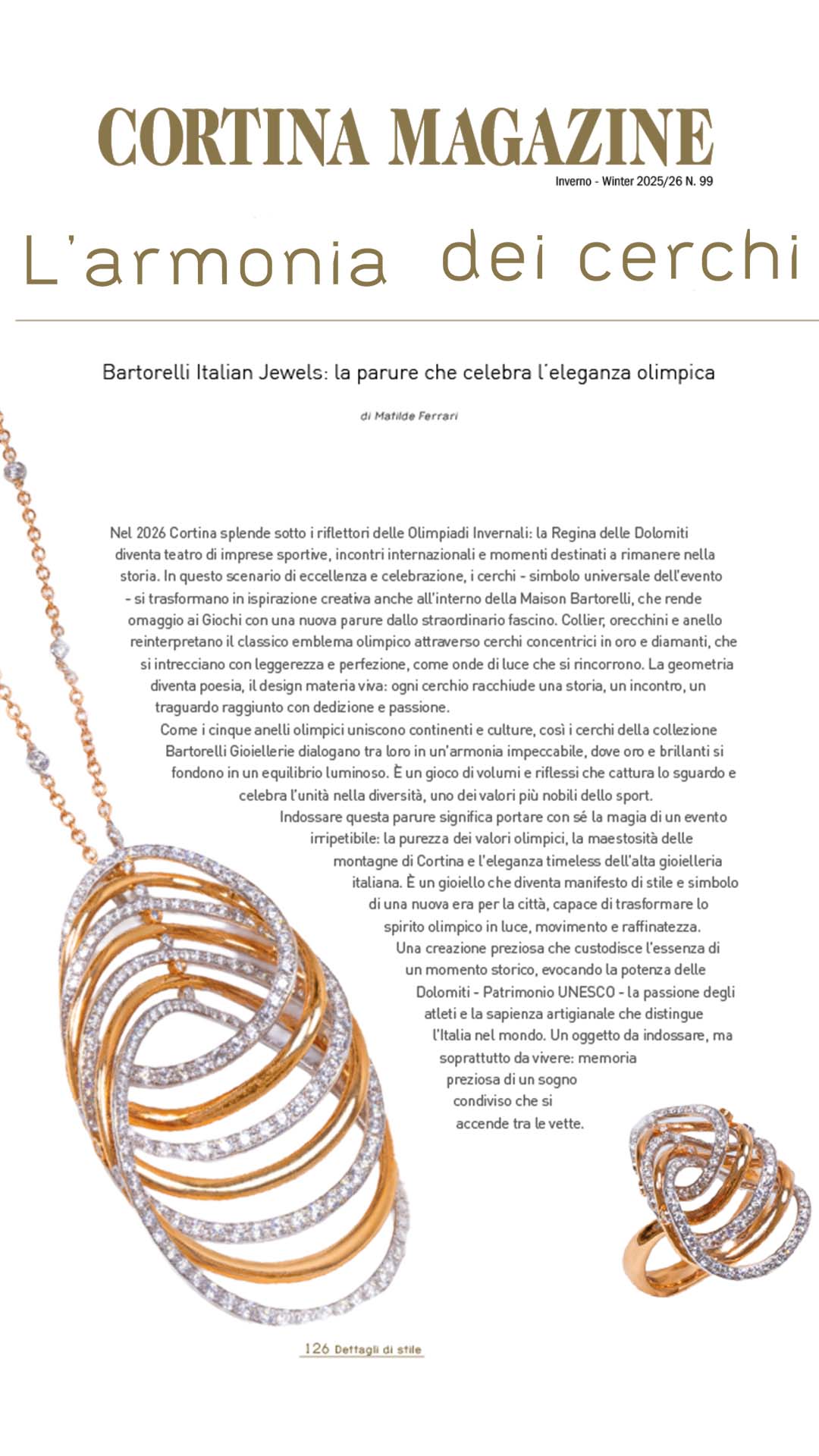 Siamo lieti di annunciare la pubblicazione su Cortina Magazine della nuova creazione esclusiva Bartorelli Italian Jewels: la parure “L’armonia dei cerchi”, un omaggio prezioso ai Giochi Olimpici Invernali di Cortina 2026.